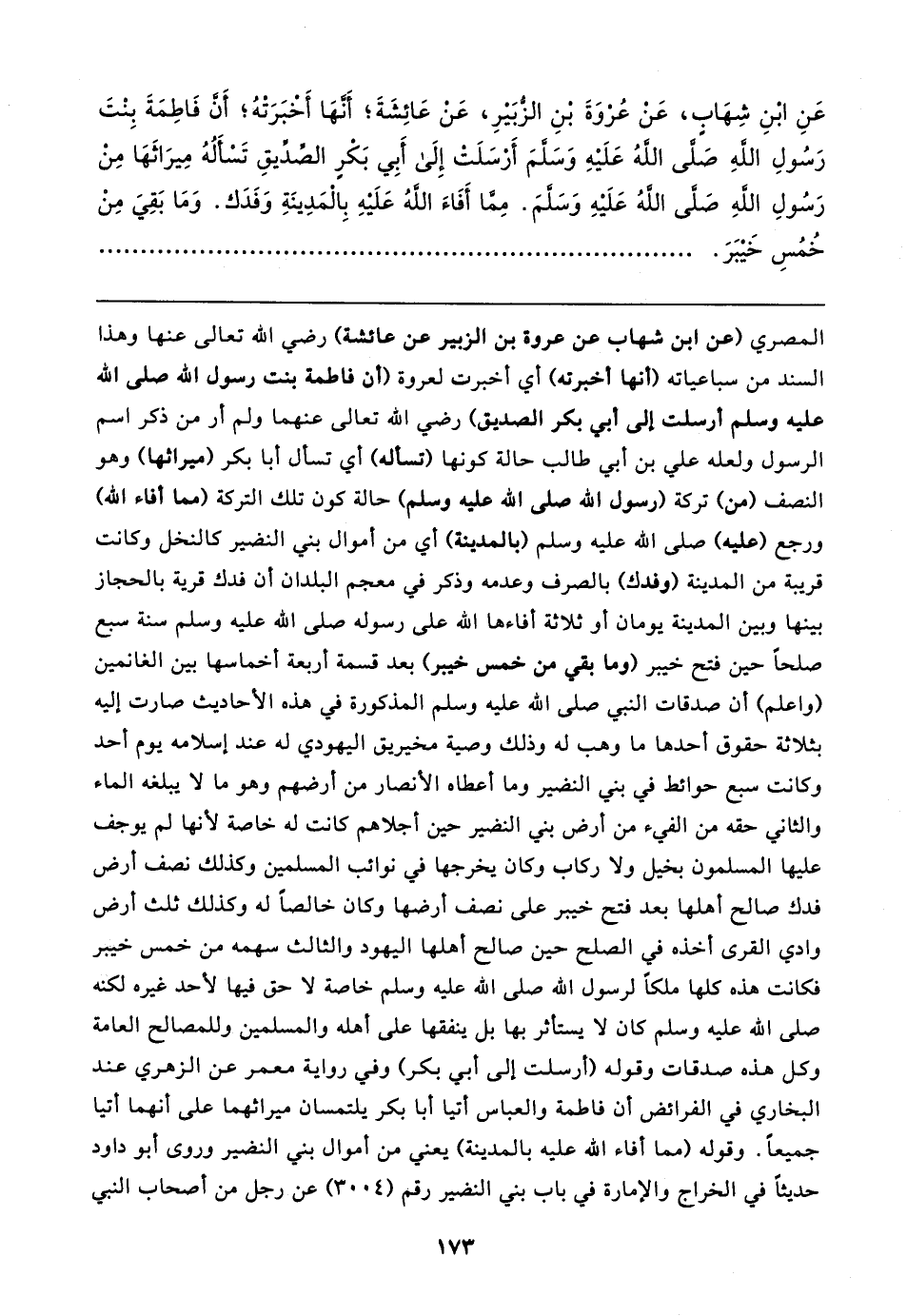 عَنِ ابْنِ شِهَابٍ، عَنْ عُرْوَةَ بْنِ الزُّبَيرِ، عَنْ عَائِشَةَ؛ أَنَّهَا أَخبَرَتهُ؛ أَنَّ فَاطِمَةَ بِنْتَ رَسُولِ اللهِ صَلَّى اللهُ عَلَيهِ وَسَلَّمَ أَرْسَلَت إِلَى أَبِي بَكرٍ الصِّدِّيقِ تَسْأَلُهُ مِيرَاثَهَا مِنْ رَسُولِ اللهِ صَلَّى اللهُ عَلَيهِ وَسَلَّمَ. مِمَّا أَفَاءَ اللهُ عَلَيهِ بِالْمَدِينَةِ وَفَدَك. وَمَا بَقِيَ مِنْ خُمُسِ خَيبَرَ