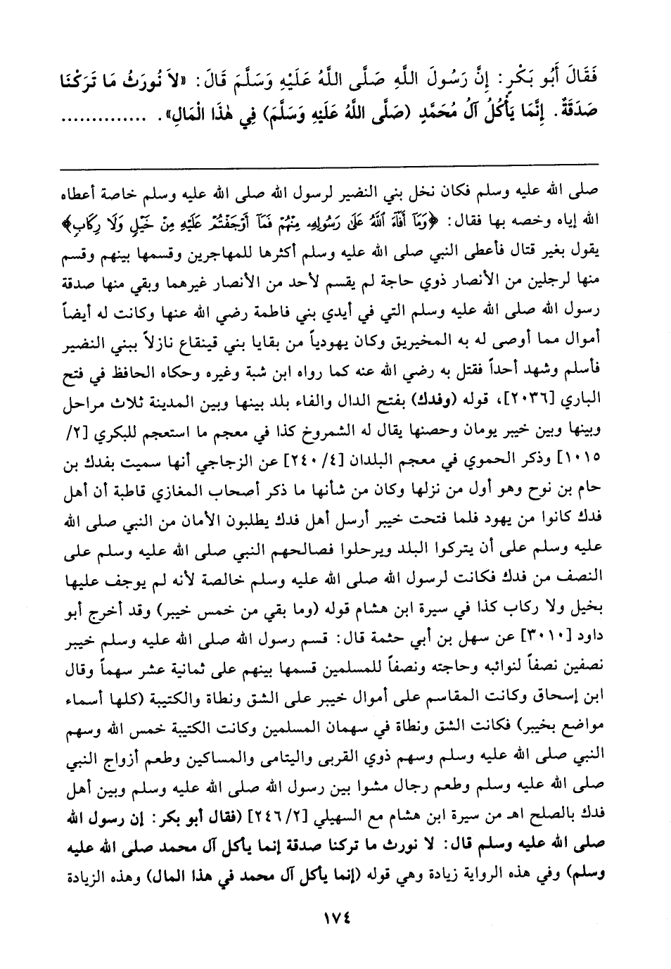 صلى الله عليه وسلم فكان نخل بني النضير لرسول الله صلى الله عليه وسلم خاصة أعطاه الله إياه وخصه بها فقال: {وَمَا أَفَاءَ اللَّهُ عَلَى رَسُولِهِ مِنْهُمْ فَمَا أَوْجَفْتُمْ عَلَيهِ مِنْ خَيلٍ وَلَا رِكَابٍ} يقول بغير قتال فأعطى النبي صلى الله عليه وسلم أكثرها للمهاجرين وقسمها بينهم وقسم منها لرجلين من الأنصار ذوي حاجة لم يقسم لأحد من الأنصار غيرهما وبقي منها صدقة رسول الله صلى الله عليه وسلم التي في أيدي بني فاطمة رضي الله عنها وكانت له أيضًا أموال مما أوصى له به المخيريق وكان يهوديًّا من بقايا بني قينقاع نازلًا ببني النضير فأسلم وشهد أحدًا فقتل به رضي الله عنه كما رواه ابن شبة وغيره وحكاه الحافظ في فتح الباري [٢٠٣٦]، قوله (وفدك) بفتح الدال والفاء بلد بينها وبين المدينة ثلاث مراحل وبينها وبين خيبر يومان وحصنها يقال له الشمروخ كذا في معجم ما استعجم للبكري [٢/ ١٠١٥] وذكر الحموي في معجم البلدان [٤/ ٢٤٠] عن الزجاجي أنها سميت بفدك بن حام بن نوح وهو أول من نزلها وكان من شأنها ما ذكر أصحاب المغازي قاطبة أن أهل فدك كانوا من يهود فلما فتحت خيبر أرسل أهل فدك يطلبون الأمان من النبي صلى الله عليه وسلم على أن يتركوا البلد ويرحلوا فصالحهم النبي صلى الله عليه وسلم على النصف من فدك فكانت لرسول الله صلى الله عليه وسلم خالصة لأنه لم يوجف عليها بخيل ولا ركاب كذا في سيرة ابن هشام قوله (وما بقي من خمس خيبر) وقد أخرج أبو داود [٣٠١٠] عن سهل بن أبي حثمة قال: قسم رسول الله صلى الله عليه وسلم خيبر نصفين نصفًا لنوائبه وحاجته ونصفًا للمسلمين قسمها بينهم على ثمانية عشر سهمًا وقال ابن إسحاق وكانت المقاسم على أموال خيبر على الشق ونطاة والكتيبة (كلها أسماء مواضع بخيبر) فكانت الشق ونطاة في سهمان المسلمين وكانت الكتيبة خمس الله وسهم النبي صلى الله عليه وسلم وسهم ذوي القربى واليتامى والمساكين وطعم أزواج النبي صلى الله عليه وسلم وطعم رجال مشوا بين رسول الله صلى الله عليه وسلم وبين أهل فدك بالصلح اهـ من سيرة ابن هشام مع السهيلي [٢/ ٢٤٦] (فقال أبو بكر: إن رسول الله صلى الله عليه وسلم قال: لا نورث ما تركنا صدقة إنما يأكل آل محمد صلى الله عليه وسلم) وفي هذه الرواية زيادة وهي قوله (إنما يأكل آل محمد في هذا المال) وهذه الزيادة