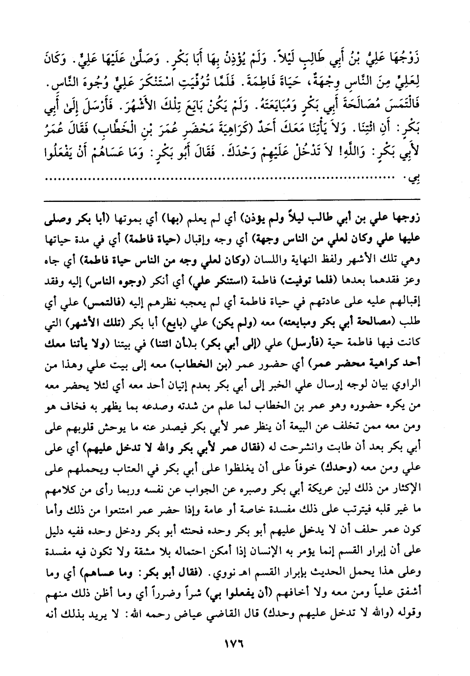 زوجها علي بن أبي طالب ليلًا ولم يؤذن) أي لم يعلم (بها) أي بموتها (أبا بكر وصلى عليها علي وكان لعلي من الناس وجهة) أي وجه وإقبال (حياة فاطمة) أي في مدة حياتها وهي تلك الأشهر ولفظ النهاية واللسان (وكان لعلي وجه من الناس حياة فاطمة) أي جاه وعز فقدهما بعدها (فلما توفيت) فاطمة (استنكر علي) أي أنكر (وجوه الناس) إليه وفقد إقبالهم عليه على عادتهم في حياة فاطمة أي لم يعجبه نظرهم إليه (فالتمس) علي أي طلب (مصالحة أبي بكر ومبايعته) معه (ولم يكن) علي (بايع) أبا بكر (تلك الأشهر) التي كانت فيها فاطمة حية (فأرسل) علي (إلى أبي بكر) بـ (ـأن ائتنا) في بيتنا (ولا يأتنا معك أحد كراهية محضر عمر) أي حضور عمر (بن الخطاب) معه إلى بيت علي وهذا من الراوي بيان لوجه إرسال علي الخبر إلى أبي بكر بعدم إتيان أحد معه أي لئلا يحضر معه من يكره حضوره وهو عمر بن الخطاب لما علم من شدته وصدعه بما يظهر به فخاف هو ومن معه ممن تخلف عن البيعة أن ينظر عمر لأبي بكر فيصدر عنه ما يوحش قلوبهم على أبي بكر بعد أن طابت وانشرحت له (فقال عمر لأبي بكر والله لا تدخل عليهم) أي على علي ومن معه (وحدك) خوفًا على أن يغلظوا على أبي بكر في العتاب ويحملهم على الإكثار من ذلك لين عريكة أبي بكر وصبره عن الجواب عن نفسه وربما رأى من كلامهم ما غير قلبه فيترتب على ذلك مفسدة خاصة أو عامة وإذا حضر عمر امتنعوا من ذلك وأما كون عمر حلف أن لا يدخل عليهم أبو بكر وحده فحنثه أبو بكر ودخل وحده ففيه دليل على أن إبرار القسم إنما يؤمر به الإنسان إذا أمكن احتماله بلا مشقة ولا تكون فيه مفسدة وعلى هذا يحمل الحديث بإبرار القسم اهـ نووي. (فقال أبو بكر: وما عساهم) أي وما أشفق عليًّا ومن معه ولا أخافهم (أن يفعلوا بي) شرًّا وضررًا أي وما أظن ذلك منهم وقوله (والله لا تدخل عليهم وحدك) قال القاضي عياض رحمه الله: لا يريد بذلك أنه