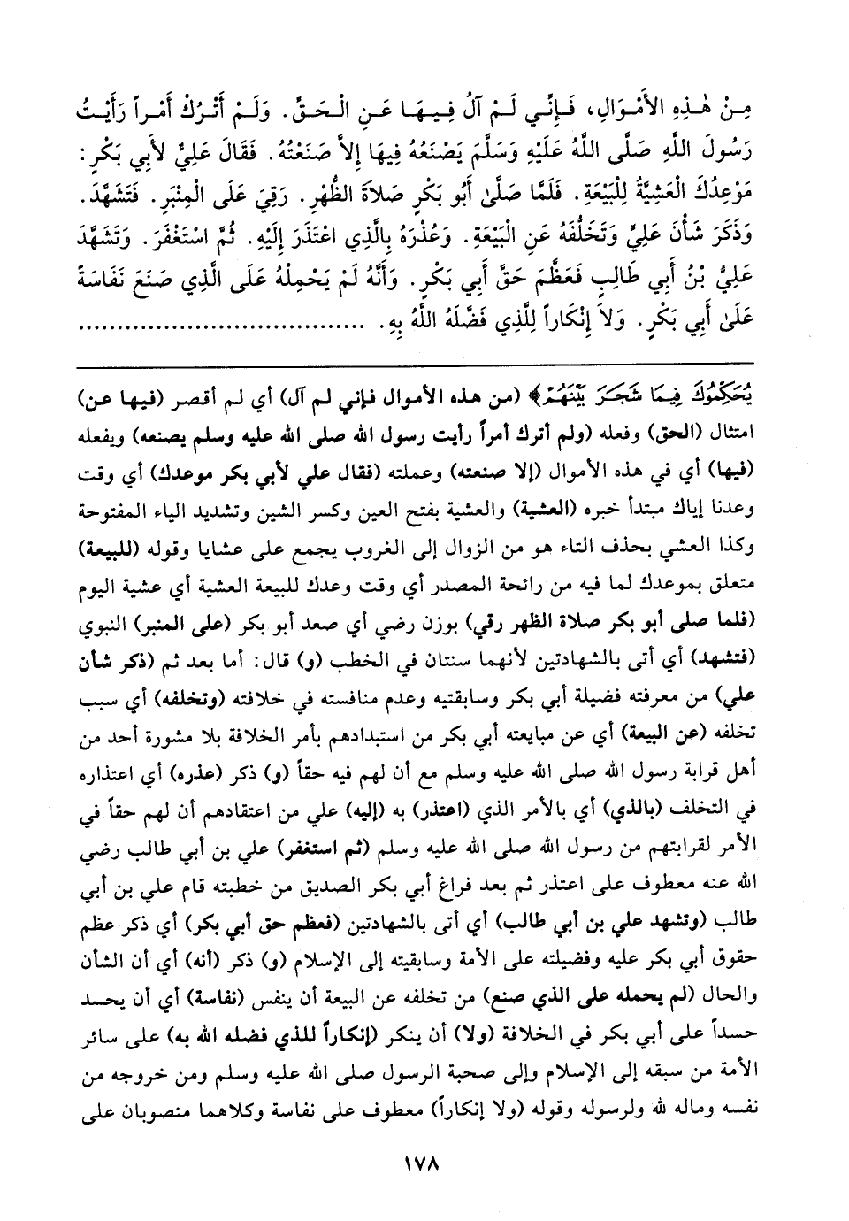 مِنْ هذِهِ الأَمْوَالِ، فَإِنِّي لَمْ آلُ فِيهَا عَنِ الحَقِّ. وَلَمْ أَتْرُك أَمْرًا رَأَيتُ رَسُولَ اللهِ صَلَّى اللهُ عَلَيهِ وَسَلَّمَ يَصْنَعُهُ فِيهَا إلا صَنَعْتُهُ. فَقَال عَلِيٌّ لأَبِي بَكرٍ: مَوْعِدُكَ الْعَشِيَّةُ لِلْبَيعَةِ. فَلَمَّا صَلَّى أَبُو بَكْرٍ صَلاةَ الظُّهْرِ. رَقِيَ عَلَى الْمِنْبَرِ. فَتَشَهَّدَ. وَذَكَرَ شَأْنَ عَلِيٍّ وَتَخَلُّفَهُ عَنِ الْبَيعَةِ. وَعُذْرَهُ بِالَّذِي اعْتَذَرَ إِلَيهِ. ثُمَّ اسْتَغفَرَ. وَتَشَهَّدَ عَلِيُّ بْنُ أَبِي طَالِبٍ فَعَظَّمَ حَقَّ أَبِي بَكْرٍ. وَأَنَّهُ لَمْ يَحْمِلْهُ عَلَى الَّذِي صَنَعَ نَفَاسَةً عَلَى أَبِي بَكْرٍ. وَلَا إِنْكَارًا لِلَّذِي فَضَّلَهُ اللهُ بِهِ