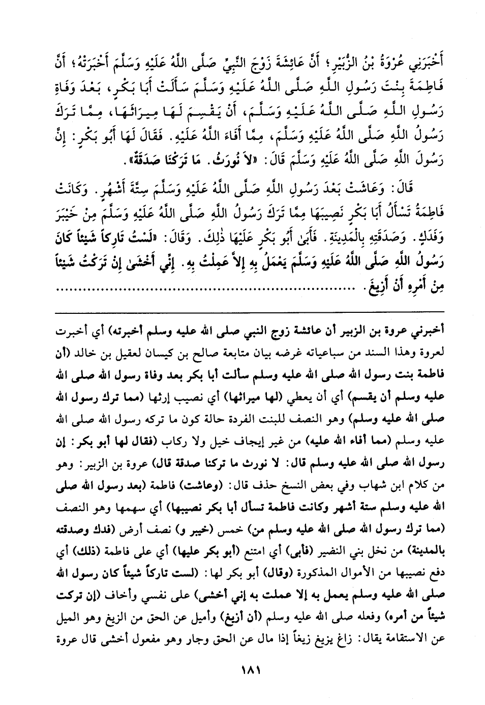 أَخْبَرَنِي عُرْوَةُ بْنُ الزُّبَيرِ؛ أَن عَائِشَةَ زَوْجَ النَّبِيِّ صَلَّى اللهُ عَلَيهِ وَسَلَّمَ أَخبَرَتهُ؛ أَنَّ فَاطِمَةَ بِنْتَ رَسُولِ اللهِ صَلَّى اللهُ عَلَيهِ وَسَلَّمَ سَألَت أَبَا بَكرٍ، بَعْدَ وَفَاةِ رَسُولِ اللهِ صَلَّى اللهُ عَلَيهِ وَسَلَّمَ، أَنْ يَقْسِمَ لَهَا مِيرَاثَهَا، مِمَّا تَرَكَ رَسُولُ اللهِ صَلَّى اللهُ عَلَيهِ وَسَلَّمَ، مِمَّا أَفَاءَ اللهُ عَلَيهِ. فَقَال لَهَا أَبُو بَكرٍ: إِنَّ رَسُولَ اللهِ صَلَّى اللهُ عَلَيهِ وَسَلَّمَ قَال: "لَا نُورَثُ. مَا تَرَكنَا صَدَقَةٌ".