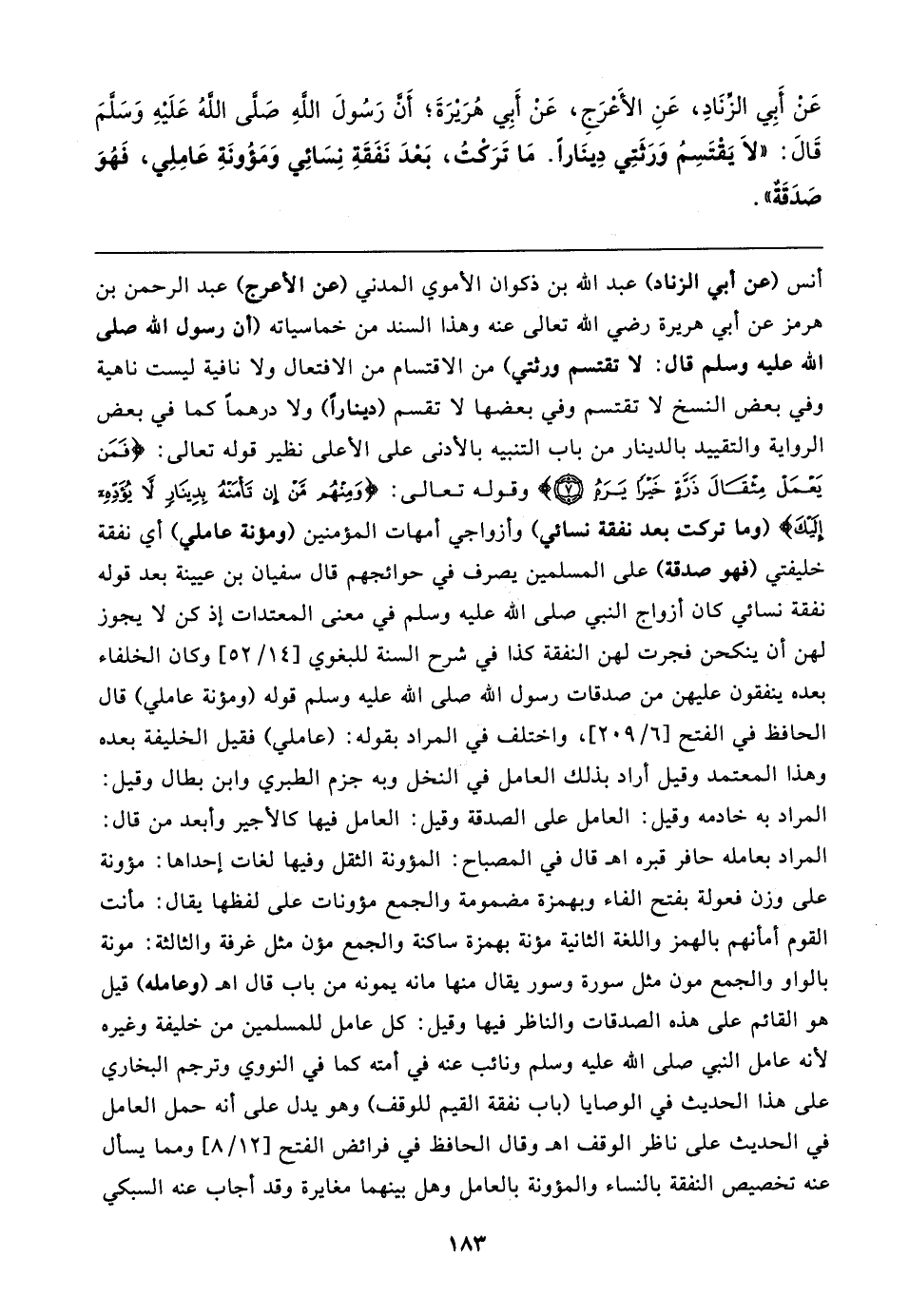 عَنْ أَبِي الزِّنَادِ، عَنِ الأَعْرَجِ، عَنْ أَبِي هُرَيرَةَ؛ أَنَّ رَسُولَ اللهِ صَلَّى اللهُ عَلَيهِ وَسَلَّمَ قَال: "لَا يَقْتَسِمُ وَرَثَتِي دِينَارًا. مَا تَرَكْتُ، بَعْدَ نَفَقَةِ نِسَائِي وَمَؤُونَةِ عَامِلِي، فَهُوَ صَدَقَةٌ"