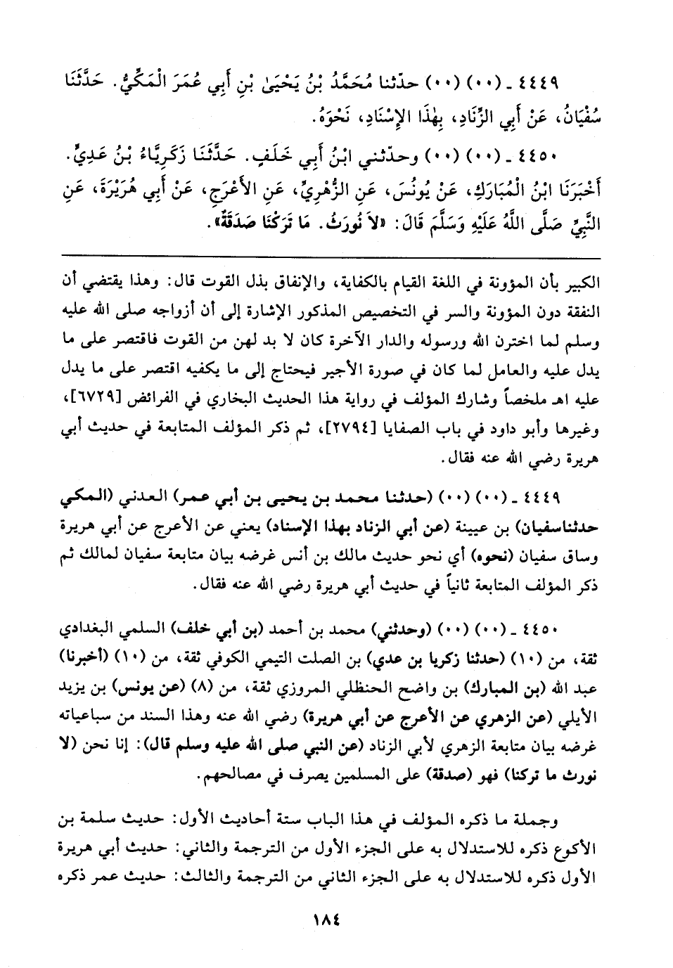 ٤٤٥٠ - (٠٠) (٠٠) (وحدثني) محمد بن أحمد (بن أبي خلف) السلمي البغدادي ثقة، من (١٠) (حدثنا زكريا بن عدي) بن الصلت التيمي الكوفي ثقة، من (١٠) (أخبرنا) عبد الله (بن المبارك) بن واضح الحنظلي المروزي ثقة، من (٨) (عن يونس) بن يزيد الأيلي (عن الزهري عن الأعرج عن أبي هريرة) رضي الله عنه وهذا السند من سباعياته غرضه بيان متابعة الزهري لأبي الزناد (عن النبي صلى الله عليه وسلم قال): إنا نحن (لا نورث ما تركنا) فهو (صدقة) على المسلمين يصرف في مصالحهم.