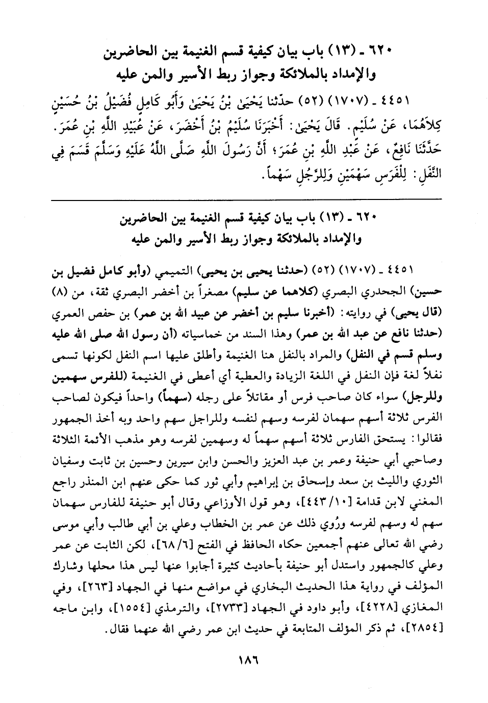 ٤٤٥١ - (١٧٠٧) (٥٢) (حدثنا يحيى بن يحيى) التميمي (وأبو كامل فضيل بن حسين) الجحدري البصري (كلاهما عن سليم) مصغرًا بن أخضر البصري ثقة، من (٨) (قال يحيى) في روايته: (أخبرنا سليم بن أخضر عن عبيد الله بن عمر) بن حفص العمري (حدثنا نافع عن عبد الله بن عمر) وهذا السند من خماسياته (أن رسول الله صلى الله عليه وسلم قسم في النفل) والمراد بالنفل هنا الغنيمة وأطلق عليها اسم النفل لكونها تسمى نفلًا لغة فإن النفل في اللغة الزيادة والعطية أي أعطى في الغنيمة (للفرس سهمين وللرجل) سواء كان صاحب فرس أو مقاتلًا على رجله (سهمًا) واحدًا فيكون لصاحب الفرس ثلاثة أسهم سهمان لفرسه وسهم لنفسه وللراجل سهم واحد وبه أخذ الجمهور فقالوا: يستحق الفارس ثلاثة أسهم سهمًا له وسهمين لفرسه وهو مذهب الأئمة الثلاثة وصاحبي أبي حنيفة وعمر بن عبد العزيز والحسن وابن سيرين وحسين بن ثابت وسفيان الثوري والليث بن سعد وإسحاق بن إبراهيم وأبي ثور كما حكى عنهم ابن المنذر راجع المغني لابن قدامة [١٠/ ٤٤٣]، وهو قول الأوزاعي وقال أبو حنيفة للفارس سهمان سهم له وسهم لفرسه ورُوي ذلك عن عمر بن الخطاب وعلي بن أبي طالب وأبي موسى رضي الله تعالى عنهم أجمعين حكاه الحافظ في الفتح [٦/ ٦٨]، لكن الثابت عن عمر وعلي كالجمهور واستدل أبو حنيفة بأحاديث كثيرة أجابوا عنها ليس هذا محلها وشارك المؤلف في رواية هذا الحديث البخاري في مواضع منها في الجهاد [٢٦٣]، وفي المغازي [٤٢٢٨]، وأبو داود في الجهاد [٢٧٣٣]، والترمذي [١٥٥٤]، وابن ماجه [٢٨٥٤]، ثم ذكر المؤلف المتابعة في حديث ابن عمر رضي الله عنهما فقال.