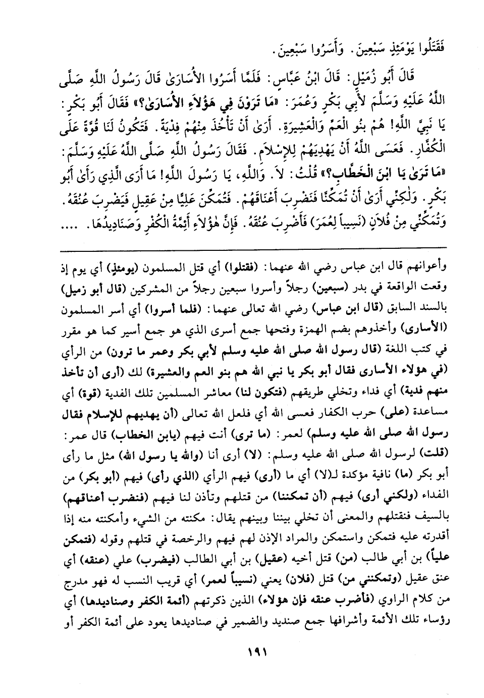 قَال أَبُو زُمَيلٍ: قَال ابْنُ عَبَّاسٍ: فَلَمَّا أَسَرُوا الأُسَارَى قَال رَسُولُ اللهِ صَلَّى اللهُ عَلَيهِ وَسَلَّمَ لأَبِي بَكرٍ وَعُمَرَ: "مَا تَرَوْنَ فِي هَؤُلاءِ الأُسُارَى؟ " فَقَال أَبُو بَكرٍ: يَا نَبِيَّ اللهِ! هُمْ بنُو الْعَمِّ وَالْعَشِيرَةِ. أَرَى أَنْ تَأْخُذَ مِنْهُمْ فِدْيَةً. فَتَكُونُ لَنَا قُوَّةً عَلَى الْكُفَّارِ. فَعَسَى اللهُ أَنْ يَهْدِيَهُمْ لِلإِسْلامِ. فَقَال رَسُولُ اللهِ صَلَّى اللهُ عَلَيهِ وَسَلَّمَ: "مَا تَرَى يَا ابْنَ الْخَطابِ؟ " قُلْتُ: لَا. وَاللهِ، يَا رَسُولَ اللهِ! مَا أَرَى الَّذِي رَأَى أَبُو بَكْرٍ. وَلكِني أَرَى أَنْ تُمَكِّنَّا فَنَضْرِبَ أَعْنَاقَهُمْ. فَتُمَكنَ عَلِيًّا مِنْ عَقِيلٍ فَيَضْرِبَ عُنُقَهُ. وَتُمَكِّنِّي مِنْ فُلانٍ (نَسِيبًا لِعُمَرَ) فَأَضْرِبَ عُنُقَهُ. فَإِنَّ هؤُلاءِ أَئِمَّةُ الْكُفْرِ وَصَنَادِيدُهَا