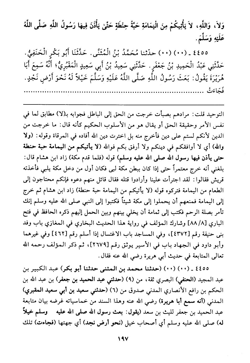 ٤٤٥٥ - (٠٠) (٠٠) حدَّثنا مُحَمَّدُ بْنُ الْمُثَنَّى. حَدَّثَنَا أَبُو بَكْرٍ الْحَنَفِيُّ. حَدَّثَنِي عَبْدُ الْحَمِيدِ بْنُ جَعْفَرٍ. حَدَّثَنِي سَعِيدُ بْنُ أَبِي سَعِيدٍ الْمَقْبُرِيُّ، أَنَّهُ سَمِعَ أَبَا هُرَيرَةَ يَقُولُ: بَعَثَ رَسُولُ اللهِ صَلَّى اللَّهُ عَلَيهِ وَسَلَّمَ خَيلًا لَهُ نَحْوَ أَرْضِ نَجْدٍ. فَجَاءَتْ