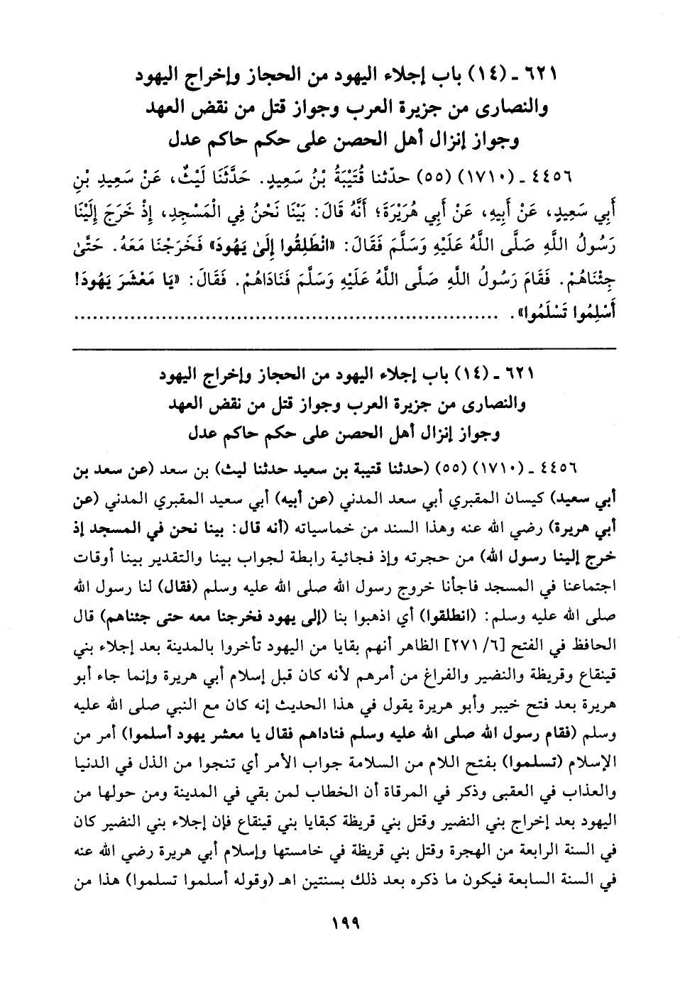 ٦٢١ - (١٤) باب إجلاء اليهود من الحجاز وإخراج اليهود والنصارى من جزيرة العرب وجواز قتل من نقض العهد وجواز إنزال أهل الحصن على حكم حاكم عدل