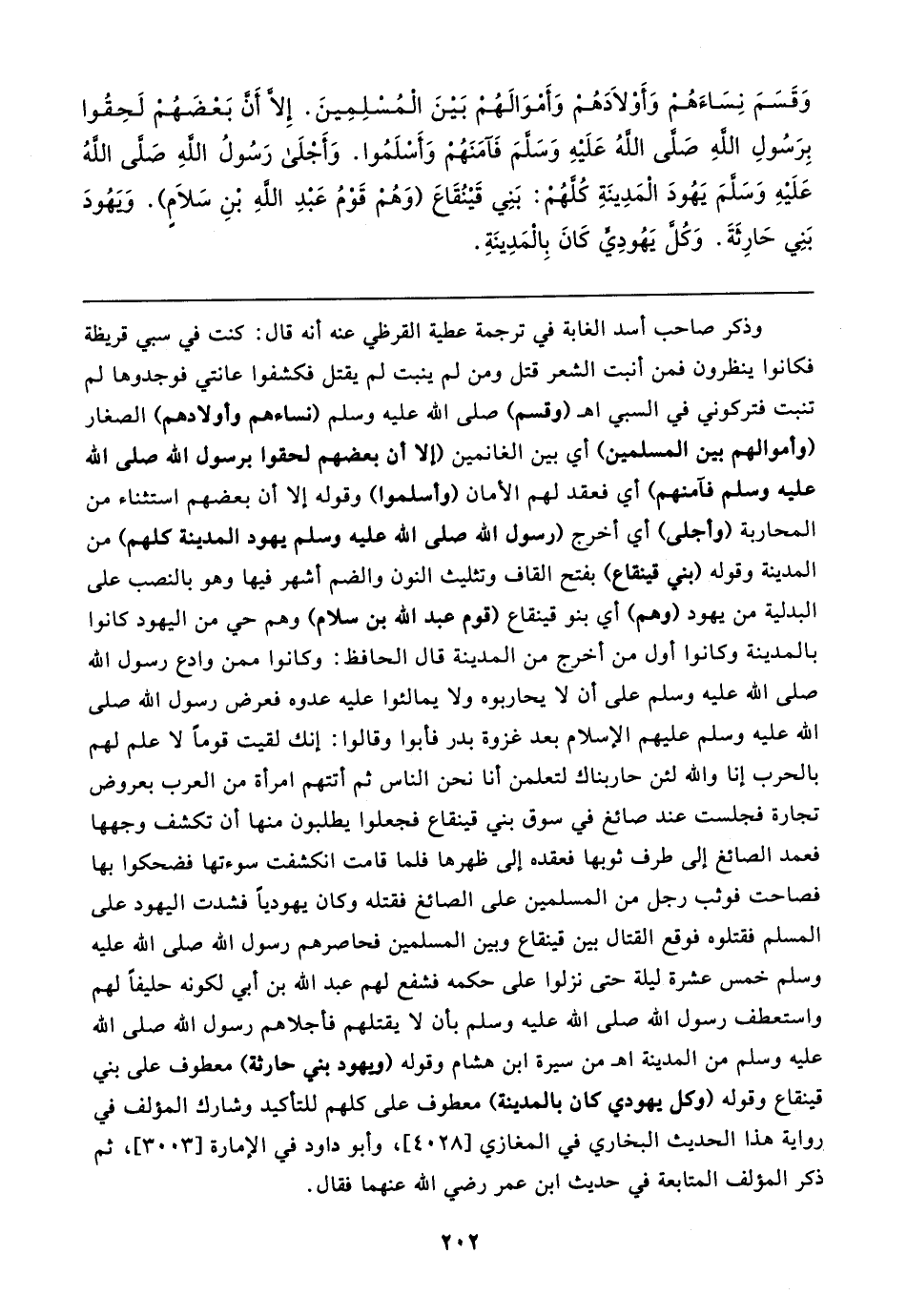 وذكر صاحب أسد الغابة في ترجمة عطية القرظي عنه أنه قال: كنت في سبي قريظة فكانوا ينظرون فمن أنبت الشعر قتل ومن لم ينبت لم يقتل فكشفوا عانتي فوجدوها لم تنبت فتركوني في السبي اهـ (وقسم) صلى الله عليه وسلم (نساءهم وأولادهم) الصغار (وأموالهم بين المسلمين) أي بين الغانمين (إلا أن بعضهم لحقوا برسول الله صلى الله عليه وسلم فآمنهم) أي فعقد لهم الأمان (وأسلموا) وقوله إلا أن بعضهم استثناء من المحاربة (وأجلى) أي أخرج (رسول الله صلى الله عليه وسلم يهود المدينة كلهم) من المدينة وقوله (بني قينقاع) بفتح القاف وتثليث النون والضم أشهر فيها وهو بالنصب على البدلية من يهود (وهم) أي بنو قينقاع (قوم عبد الله بن سلام) وهم حي من اليهود كانوا بالمدينة وكانوا أول من أخرج من المدينة قال الحافظ: وكانوا ممن وادع رسول الله صلى الله عليه وسلم على أن لا يحاربوه ولا يمالئوا عليه عدوه فعرض رسول الله صلى الله عليه وسلم عليهم الإسلام بعد غزوة بدر فأبوا وقالوا: إنك لقيت قومًا لا علم لهم بالحرب إنا والله لئن حاربناك لتعلمن أنا نحن الناس ثم أتتهم امرأة من العرب بعروض تجارة فجلست عند صائغ في سوق بني قينقاع فجعلوا يطلبون منها أن تكشف وجهها فعمد الصائغ إلى طرف ثوبها فعقده إلى ظهرها فلما قامت انكشفت سوءتها فضحكوا بها فصاحت فوثب رجل من المسلمين على الصائغ فقتله وكان يهوديًّا فشدت اليهود على المسلم فقتلوه فوقع القتال بين قينقاع وبين المسلمين فحاصرهم رسول الله صلى الله عليه وسلم خمس عشرة ليلة حتى نزلوا على حكمه فشفع لهم عبد الله بن أبي لكونه حليفًا لهم واستعطف رسول الله صلى الله عليه وسلم بأن لا يقتلهم فأجلاهم رسول الله صلى الله عليه وسلم من المدينة اهـ من سيرة ابن هشام وقوله (ويهود بني حارثة) معطوف علي بني قينقاع وقوله (وكل يهودي كان بالمدينة) معطوف على كلهم للتأكيد وشارك المؤلف في رواية هذا الحديث البخاري في المغازي [٤٠٢٨]، وأبو داود في الإمارة [٣٠٥٣]، ثم ذكر المؤلف المتابعة في حديث ابن عمر رضي الله عنهما فقال.