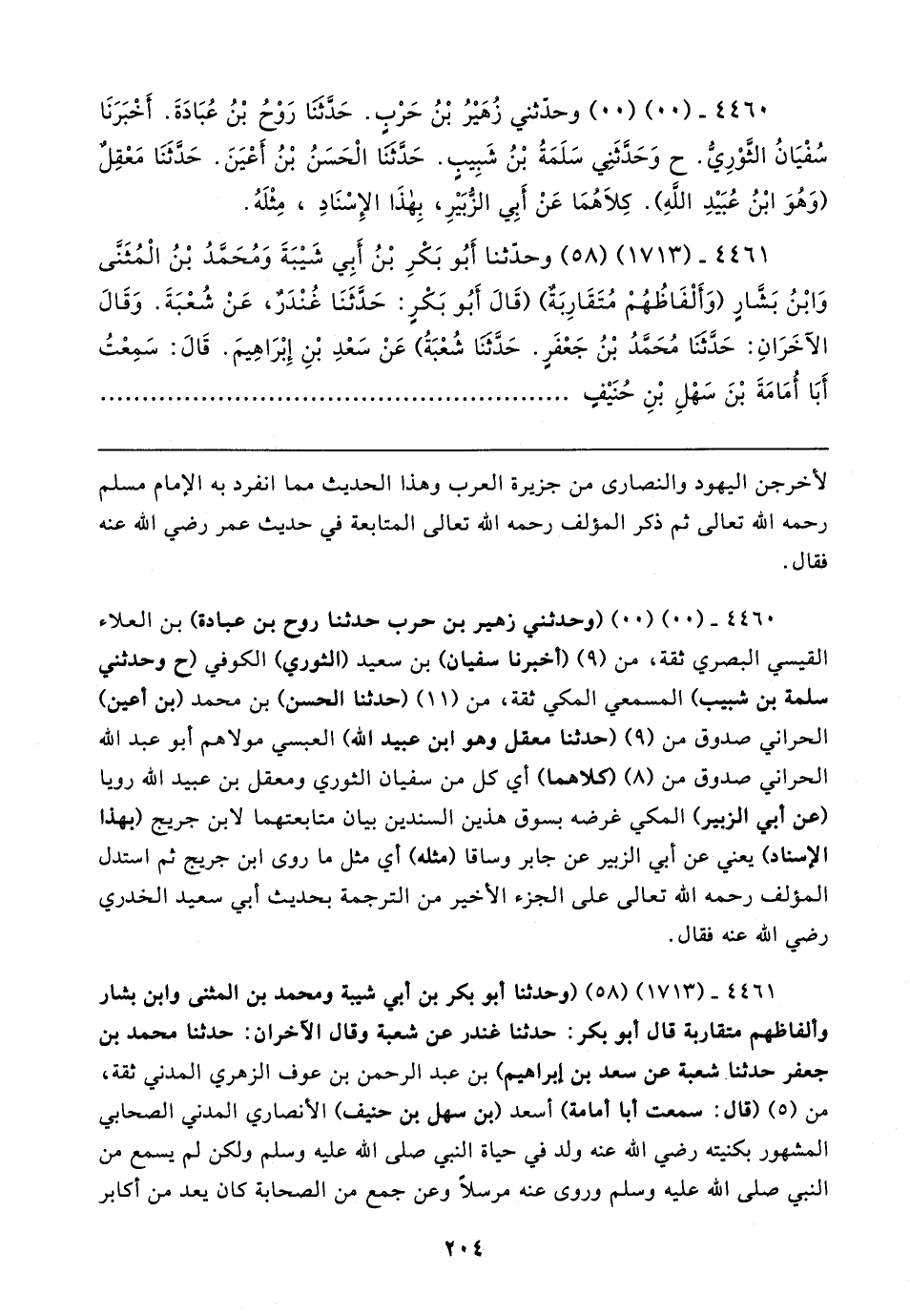 ٤٤٦٠ - (٠٠) (٠٠) (وحدثني زهير بن حرب حدثنا روح بن عبادة) بن العلاء القيسي البصري ثقة، من (٩) (أخبرنا سفيان) بن سعيد (الثوري) الكوفي (ح وحدثني سلمة بن شبيب) المسمعي المكي ثقة، من (١١) (حدثنا الحسن) بن محمد (بن أعين) الحراني صدوق من (٩) (حدثنا معقل وهو ابن عبيد الله) العبسي مولاهم أبو عبد الله الحراني صدوق من (٨) (كلاهما) أي كل من سفيان الثوري ومعقل بن عبيد الله رويا (عن أبي الزبير) المكي غرضه بسوق هذين السندين بيان متابعتهما لابن جريج (بهذا الإسناد) يعني عن أبي الزبير عن جابر وساقا (مثله) أي مثل ما روى ابن جريج ثم استدل المؤلف رحمه الله تعالى على الجزء الأخير من الترجمة بحديث أبي سعيد الخدري رضي الله عنه فقال.