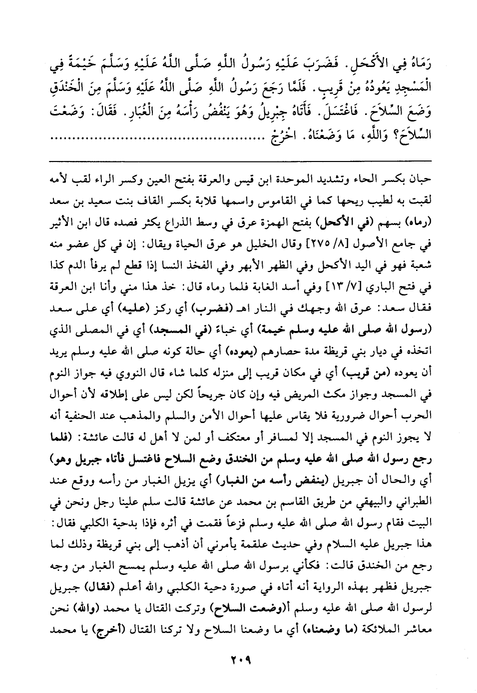 حبان بكسر الحاء وتشديد الموحدة ابن قيس والعرقة بفتح العين وكسر الراء لقب لأمه لقبت به لطيب ريحها كما في القاموس واسمها قلابة بكسر القاف بنت سعيد بن سعد (رماه) بسهم (في الأكحل) بفتح الهمزة عرق في وسط الذراع يكثر فصده قال ابن الأثير في جامع الأصول [٨/ ٢٧٥] وقال الخليل هو عرق الحياة ويقال: إن في كل عضو منه شعبة فهو في اليد الأكحل وفي الظهر الأبهر وفي الفخذ النسا إذا قطع لم يرفأ الدم كذا في فتح الباري [٧/ ١٣] وفي أسد الغابة فلما رماه قال: خذ هذا مني وأنا ابن العرقة فقال سعد: عرق الله وجهك في النار اهـ (فضرب) أي ركز (عليه) أي على سعد (رسول الله صلى الله عليه وسلم خيمة) أي خباءً (في المسجد) أي في المصلى الذي اتخذه في ديار بني قريظة مدة حصارهم (يعوده) أي حالة كونه صلى الله عليه وسلم يريد أن يعوده (من قريب) أي في مكان قريب إلى منزله كلما شاء قال النووي فيه جواز النوم في المسجد وجواز مكث المريض فيه وإن كان جريحًا لكن ليس على إطلاقه لأن أحوال الحرب أحوال ضرورية فلا يقاس عليها أحوال الأمن والسلم والمذهب عند الحنفية أنه لا يجوز النوم في المسجد إلا لمسافر أو معتكف أو لمن لا أهل له قالت عائشة: (فلما رجع رسول الله صلى الله عليه وسلم من الخندق وضع السلاح فاغتسل فأتاه جبريل وهو) أي والحال أن جبريل (ينفض رأسه من الغبار) أي يزيل الغبار من رأسه ووقع عند الطبراني والبيهقي من طريق القاسم بن محمد عن عائشة قالت سلم علينا رجل ونحن في البيت فقام رسول الله صلى الله عليه وسلم فزعًا فقمت في أثره فماذا بدحية الكلبي فقال: هذا جبريل - عليه السلام - وفي حديث علقمة يأمرني أن أذهب إلى بني قريظة وذلك لما رجع من الخندق قالت: فكأني برسول الله صلى الله عليه وسلم يمسح الغبار من وجه جبريل فظهر بهذه الرواية أنه أتاه في صورة دحية الكلبي والله أعلم (فقال) جبريل لرسول الله صلى الله عليه وسلم أ (وضعت السلاح) وتركت القتال يا محمد (والله) نحن معاشر الملائكة (ما وضعناه) أي ما وضعنا السلاح ولا تركنا القتال (أخرج) يا محمد