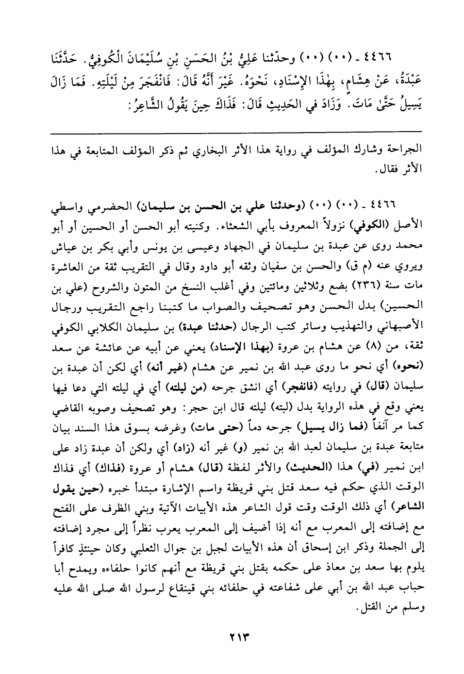 ٤٤٦٦ - (٠٠) (٥٠) (وحدثنا علي بن الحسن بن سليمان) الحضرمي واسطي الأصل (الكوفي) نزولًا المعروف بأبي الشعثاء. وكنيته أبو الحسن أو الحسين أو أبو محمد روى عن عبدة بن سليمان في الجهاد وعيسى بن يونس وأبي بكر بن عياش ويروي عنه (م ق) والحسن بن سفيان وثقه أبو داود وقال في التقريب ثقة من العاشرة مات سنة (٢٣٦) بضع وثلاثين ومائتين وفي أغلب النسخ من المتون والشروح (علي بن الحسين) بدل الحسن وهو تصحيف والصواب ما كتبنا راجع التقريب ورجال الأصبهاني والتهذيب وسائر كتب الرجال (حدثنا عبدة) بن سليمان الكلابي الكوفي ثقة، من (٨) عن هشام بن عروة (بهذا الإسناد) يعني عن أبيه عن عائشة عن سعد (نحوه) أي نحو ما روى عبد الله بن نمير عن هشام (غير أنه) أي لكن أن عبدة بن سليمان (قال) في روايته (فانفجر) أي انشق جرحه (من ليلته) أي في ليلته التي دعا فيها يعني وقع في هذه الرواية بدل (لبته) ليلته قال ابن حجر: وهو تصحيف وصوبه القاضي كما مر آنفًا (فما زال يسيل) جرحه دمًا (حتى مات) وغرضه بسوق هذا السند بيان متابعة عبدة بن سليمان لعبد الله بن نمير (و) غير أنه (زاد) أي ولكن أن عبدة زاد على ابن نمير (في) هذا (الحديث) والأثر لفظة (قال) هشام أو عروة (فذاك) أي فذاك الوقت الذي حكم فيه سعد قتل بني قريظة واسم الإشارة مبتدأ خبره (حين يقول الشاعر) أي ذلك الوقت وقت قول الشاعر هذه الأبيات الآتية وبني الظرف على الفتح مع إضافته إلى المعرب مع أنه إذا أضيف إلى المعرب يعرب نظرًا إلى مجرد إضافته إلى الجملة وذكر ابن إسحاق أن هذه الأبيات لجبل بن جوال الثعلبي وكان حينئذٍ كافرًا يلوم بها سعد بن معاذ على حكمه بقتل بني قريظة مع أنهم كانوا حلفاءه ويمدح أبا حباب عبد الله بن أبي على شفاعته في حلفائه بني قينقاع لرسول الله صلى الله عليه وسلم من القتل.