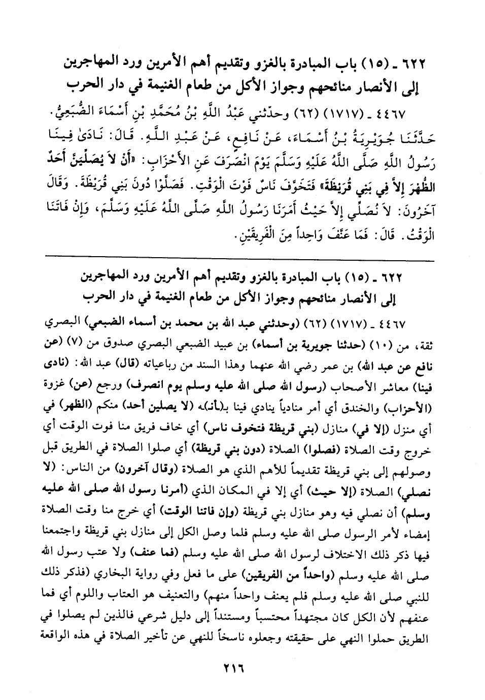 ٤٤٦٧ - (١٧١٧) (٦٢) (وحدثني عبد الله بن محمد بن أسماء الضبعي) البصري ثقة، من (١٠) (حدثنا جويرية بن أسماء) بن عبيد الضبعي البصري صدوق من (٧) (عن نافع عن عبد الله) بن عمر رضي الله عنهما وهذا السند من رباعياته (قال) عبد الله: (نادى فينا) معاشر الأصحاب (رسول الله صلى الله عليه وسلم يوم انصرف) ورجع (عن) غزوة (الأحزاب) والخندق أي أمر مناديًا ينادي فينا بـ (ـأنـ) ـه (لا يصلين أحد) منكم (الظهر) في أي منزل (إلا في) منازل (بني قريظة فتخوف ناس) أي خاف فريق منا فوت الوقت أي خروج وقت الصلاة (فصلوا) الصلاة (دون بني قريظة) أي صلوا الصلاة في الطريق قبل وصولهم إلى بني قريظة تقديمًا للأهم الذي هو الصلاة (وقال آخرون) من الناس: (لا نصلي) الصلاة (إلا حيث) أي إلا في المكان الذي (أمرنا رسول الله صلى الله عليه وسلم) أن نصلي فيه وهو منازل بني قريظة (وإن فاتنا الوقت) أي خرج منا وقت الصلاة إمضاء لأمر الرسول صلى الله عليه وسلم فلما وصل الكل إلى منازل بني قريظة واجتمعنا فيها ذكر ذلك الاختلاف لرسول الله صلى الله عليه وسلم (فما عنف) ولا عتب رسول الله صلى الله عليه وسلم (واحدًا من الفريقين) على ما فعل وفي رواية البخاري (فذكر ذلك للنبي صلى الله عليه وسلم فلم يعنف واحدًا منهم) والتعنيف هو العتاب واللوم أي فما عنفهم لأن الكل كان مجتهدًا محتسبًا ومستندًا إلى دليل شرعي فالذين لم يصلوا في الطريق حملوا النهي على حقيقته وجعلوه ناسخًا للنهي عن تأخير الصلاة في هذه الواقعة