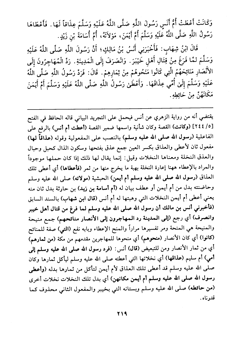قَال ابنُ شِهَابٍ: فَأَخبَرَنِي أنسُ بْنُ مَالِكٍ؛ أَن رَسُولَ الله صلى الله عَلَيهِ وَسَلمَ لما فَرَغَ مِنْ قِتَالِ أَهْلِ خَيبَرَ. وَانْصَرَفَ إِلَى الْمَدِينَةِ. رَد الْمُهَاجِرُونَ إِلَى الأَنْصَارِ مَنَائِحَهُمُ التِي كَانُوا مَنَحُوهُم مِنْ ثِمَارِهِم. قَال: فَرَد رَسُولُ الله صلى الله عَلَيهِ وَسَلمَ إِلَى أُمي عِذَاقَهَا. وَأَعْطَى رَسُولُ الله صلى الله عَلَيهِ وَسَلمَ أَم أَيمَنَ مَكَانَهُن مِنْ حَائِطِهِ