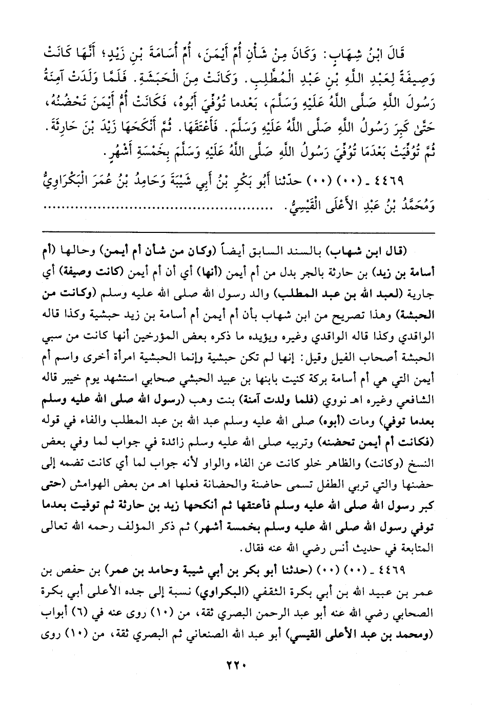 قَال ابْنُ شِهَابٍ: وَكَانَ مِنْ شَأنِ أُم أيمَنَ، أُم أُسَامَةَ بْنِ زيدٍ؛ أَنهَا كَانَتْ وَصِيفَةً لِعَبْدِ الله بْنِ عَبْدِ الْمُطلِبِ. وَكَانَتْ مِنَ الْحَبَشَةِ. فَلَما وَلَدَتْ آمِنَةُ رَسُولَ الله صَلى الله عَلَيهِ وَسَلمَ، بَعْدما تُوُفِّيَ أَبُوهُ، فَكَانَتْ أُم أَيمَنَ تَحْضُنُهُ، حَتَّى كَبِرَ رَسُولُ الله صلى اللهُ عَلَيهِ وَسَلمَ. فَأَعْتَقَهَا. ثُم أَنْكَحَهَا زَيدَ بْنَ حَارِثَةَ. ثُم تُوُفِّيَتْ بَعْدَمَا تُوُفِّيَ رَسُولُ الله صلى الله عَلَيهِ وَسَلمَ بِخَمْسَةِ أَشْهُرٍ.