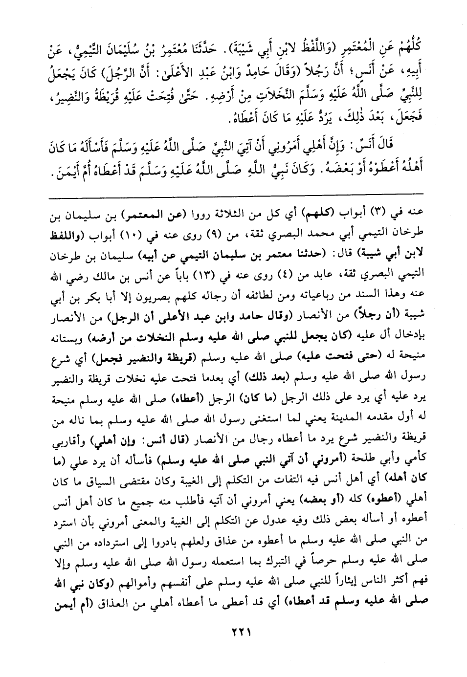عنه في (٣) أبواب (كلهم) أي كل من الثلاثة رووا (عن المعتمر) بن سليمان بن طرخان التيمي أبي محمد البصري ثقة، من (٩) روى عنه في (١٠) أبواب (واللفظ لابن أبي شيبة) قال: (حدثنا معتمر بن سليمان التيمي عن أبيه) سليمان بن طرخان التيمي البصري ثقة، عابد من (٤) روى عنه في (١٣) بابا عن أنس بن مالك رضي الله عنه وهذا السند من رباعياته ومن لطائفه أن رجاله كلهم بصريون إلا أبا بكر بن أبي شيبة (أن رجلًا) من الأنصار (وقال حامد وابن عبد الأعلى أن الرجل) من الأنصار بإدخال أل عليه (كان يجعل للنبي صلى الله عليه وسلم النخلات من أرضه) وبستانه منيحة له (حتى فتحت عليه) صلى الله عليه وسلم (قريظة والنضير فجعل) أي شرع رسول الله صلى الله عليه وسلم (بعد ذلك) أي بعدما فتحت عليه نخلات قريظة والنضير يرد عليه أي يرد على ذلك الرجل (ما كان) الرجل (أعطاه) صلى الله عليه وسلم منيحة له أول مقدمه المدينة يعني لما استغنى رسول الله صلى الله عليه وسلم بما ناله من قريظة والنضير شرع يرد ما أعطاه رجال من الأنصار (قال أنس: وإن أهلي) وأقاربي كأمي وأبي طلحة (أمروني أن آتي النبي صلى الله عليه وسلم) فأسأله أن يرد علي (ما كان أهله) أي أهل أنس فيه التفات من التكلم إلى الغيبة وكان مقتضى السياق ما كان أهلي (أعطوه) كله (أو بعضه) يعني أمروني أن آتيه فأطلب منه جميع ما كان أهل أنس أعطوه أو أسأله بعض ذلك وفيه عدول عن التكلم إلى الغيبة والمعنى أمروني بأن استرد من النبي صلى الله عليه وسلم ما أعطوه من عذاق ولعلهم بادروا إلى استرداده من النبي صلى الله عليه وسلم حرصًا في التبرك بما استعمله رسول الله صلى الله عليه وسلم وإلا فهم أكثر الناس إيثارًا للنبي صلى الله عليه وسلم على أنفسهم وأموالهم (وكان نبي الله صلى الله عليه وسلم قد أعطاه) أي قد أعطى ما أعطاه أهلي من العذاق (أم أيمن