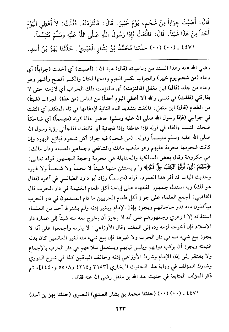 رضي الله عنه وهذا السند من رباعياته (قال) عبد الله: (أصبت) أي أخذت (جرابًا) أي وعاء (من شحم يوم خيبر) والجراب بكسر الجيم وفتحها لغتان والكسر أفصح وأشهر وهو وعاء من جلد (قال) ابن مغفل (فالتزمته) أي فالتزمت ذلك الجراب أي لازمته حتى لا يفارقني (فقلت) في نفسي والله (لا أعطي اليوم أحدًا) من الناس (من هذا) الجراب (شيئًا) من الطعام (قال) ابن مغفل: فالتفت بتشديد التاء الثانية لإدغامها في تاء المتكلم أي التفت في جوانبي (فإذا رسول الله صلى الله عليه وسلم) حاضر حالة كونه (متبسمًا) أي ضاحكًا ضحك التبسم والفاء في قوله فإذا عاطفة وإذا فجائية أي فالتفت ففاجأني رؤية رسول الله صلى الله عليه وسلم متبسمًا وقوله: (من شحم) فيه جواز أكل شحوم ذبائح اليهود وإن كانت شحومها محرمة عليهم وهو مذهب مالك والشافعي وجماهير العلماء وقال مالك: هي مكروهة وقال بعض المالكية والحنابلة هي محرمة وحجة الجمهور قوله تعالى: {وَطَعَامُ الَّذِينَ أُوتُوا الْكِتَابَ حِلٌّ لَكُمْ} ولم يستثن منها شيئًا لا لحمًا ولا شحمًا ولا غيره وحديث الباب قد أقر هذا العموم. قوله (متبسمًا) وزاد أبو داود الطيالسي في آخره (فقال هو لك) وبه استدل جمهور الفقهاء على إباحة أكل طعام الغنيمة في دار الحرب قال القاضي: أجمع العلماء على جواز أكل طعام الحربيين ما دام المسلمون في دار الحرب فيأكلون منه قدر حاجاتهم ويجوز بإذن الإمام وبغير إذنه ولم يشترط أحد من العلماء استئذانه إلا الزهري وجمهورهم على أنه لا يجوز أن يخرج معه منه شيئًا إلى عمارة دار الإسلام فإن أخرجه لزمه رده إلى المغنم وقال الأوزاعي: لا يلزمه وأجمعوا على أنه لا يجوز بيع شيء منه في دار الحرب ولا غيرها فإن بيع شيء منه لغير الغانمين كان بدله غنيمته ويجوز أن يركب دوابهم ويلبس ثيابهم ويستعمل سلاحهم في دار الحرب بالإجماع ولا يفتقر إلى إذن الإمام وشرط الأوزاعي إذنه وخالف الباقين كذا في شرح النووي وشارك المؤلف في رواية هذا الحديث البخاري [٣١٥٣ و ٤٢١٤ و ٥٥٠٨ و ٤٤٤٠]، ثم ذكر المؤلف المتابعة في حديث عبد الله بن مغفل رضي الله عنه فقال.