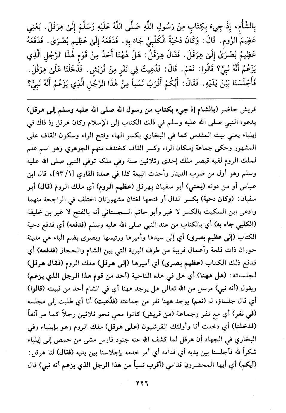 بِالشأمِ، إِذْ جِيءَ بِكِتَابِ مِن رَسُولِ الله صلى الله عَلَيهِ وَسَلمَ إِلَي هِرَقلَ. يَعنِي عَظِيمَ الرومِ. قَال: وَكَانَ دَحيَةُ الكَلْبِى جَاءَ بِهِ. فَدَفَعَهُ إِلَى عَظِيمِ بُصرَى. فَدَفَعَهُ عَظِيمُ بُصرَى إِلَى هِرَقْلَ. فَقَال هِرَقلُ: هَل ههُنَا أحَد مِنْ قَوْمِ هذَا الرجُلِ الذِي يَزْعُمُ أنهُ نَبِيٌّ؟ قَالُوا: نَعَمْ. قَال: فَدُعِيتُ فِي نَفَرٍ مِنْ قُرَيشٍ. فَدَخَلْنَا عَلَى هِرَقلَ. فَأجْلَسَنَا بَينَ يَدَيهِ. فَقَال: أيُّكُم أقْرَبُ نَسَبًا مِن هذَا الرجُلِ الذِي يَزعُمُ أَنهُ نَبِيٌّ؟