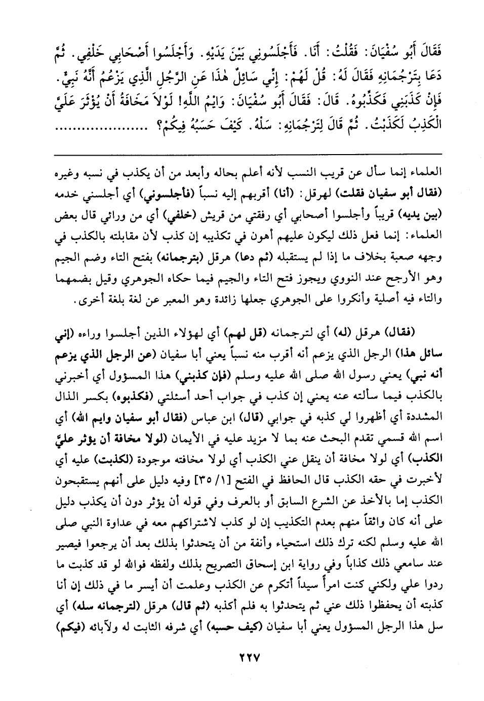 فَقَال أَبُو سُفْيَانَ: فَقُلْتُ: أَنا. فَأجلَسُونِي بَينَ يَدَيهِ. وَأَجلَسُوا أَصْحَابِي خَلفِي. ثُم دَعَا بِتَرجُمَانِهِ فَقَال لَهُ: قُل لَهُمْ: إِني سَائِلٌ هذَا عَنِ الرجُلِ الذِي يَزعُمُ أَنهُ نَبِي. فَإِنْ كَذَبَنِي فَكَذِّبُوهُ. قَال: فَقَال أَبُو سُفْيَانَ: وَايمُ الله! لَولا مَخَافَةُ أَن يُؤثَرَ عَلَى الْكَذِبُ لَكَذَبْتُ. ثُم قَال لِتَرْجُمَانِهِ: سَلْهُ. كَيفَ حَسَبُهُ فِيكُم؟