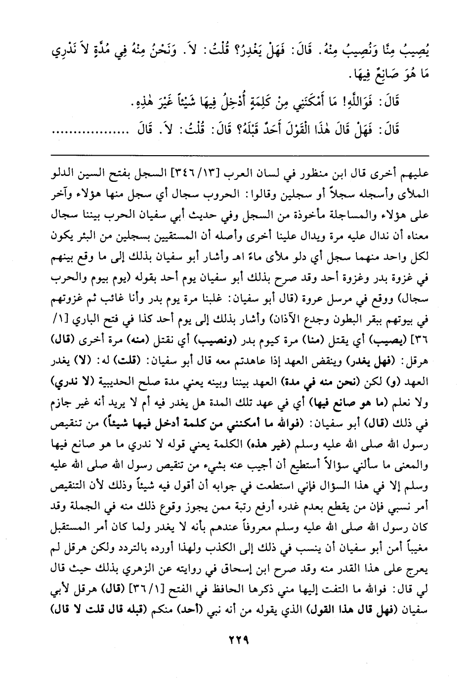 عليهم أخرى قال ابن منظور في لسان العرب [١٣/ ٣٤٦] السجل بفتح السين الدلو الملأى وأسجله سجلًا أو سجلين وقالوا: الحروب سجال أي سجل منها هؤلاء وآخر على هؤلاء والمساجلة مأخوذة من السجل وفي حديث أبي سفيان الحرب بيننا سجال معناه أن ندال عليه مرة ويدال علينا أخرى وأصله أن المستقيين بسجلين من البئر يكون لكل واحد منهما سجل أي دلو ملأى ماءً اهـ وأشار أبو سفيان بذلك إلى ما وقع بينهم في غزوة بدر وغزوة أحد وقد صرح بذلك أبو سفيان يوم أحد بقوله (يوم بيوم والحرب سجال) ووقع في مرسل عروة (قال أبو سفيان: غلبنا مرة يوم بدر وأنا غائب ثم غزوتهم في بيوتهم ببقر البطون وجدع الآذان) وأشار بذلك إلى يوم أحد كذا في فتح الباري [١/ ٣٦] (يصيب) أي يقتل (منا) مرة كيوم بدر (ونصيب) أي نقتل (منه) مرة أخرى (قال) هرقل: (فهل يغدر) وينقض العهد إذا عاهدتم معه قال أبو سفيان: (قلت) له: (لا) يغدر العهد (و) لكن (نحن منه في مدة) العهد بيننا وبينه يعني مدة صلح الحديبية (لا ندري) ولا نعلم (ما هو صانع فيها) أي في عهد تلك المدة هل يغدر فيه أم لا يريد أنه غير جازم في ذلك (قال) أبو سفيان: (فوالله ما أمكنني من كلمة أدخل فيها شيئًا) من تنقبص رسول الله صلى الله عليه وسلم (غير هذه) الكلمة يعني قوله لا ندري ما هو صانع فيها والمعنى ما سألني سؤالًا أستطيع أن أجيب عنه بشيء من تنقيص رسول الله صلى الله عليه وسلم إلا في هذا السؤال فإني استطعت في جوابه أن أقول فيه شيئًا وذلك لأن التنقيص أمر نسبي فإن من يقطع بعدم غدره أرفع رتبة ممن يجوز وقوع ذلك منه في الجملة وقد كان رسول الله صلى الله عليه وسلم معروفًا عندهم بأنه لا يغدر ولما كان أمر المستقبل مغيبًا أمن أبو سفيان أن ينسب في ذلك إلى الكذب ولهذا أورده بالتردد ولكن هرقل لم يعرج على هذا القدر منه وقد صرح ابن إسحاق في روايته عن الزهري بذلك حيث قال لي قال: فوالله ما التفت إليها مني ذكرها الحافظ في الفتح [١/ ٣٦] (قال) هرقل لأبي سفيان (فهل قال هذا القول) الذي يقوله من أنه نبي (أحد) منكم (قبله قال قلت لا قال)