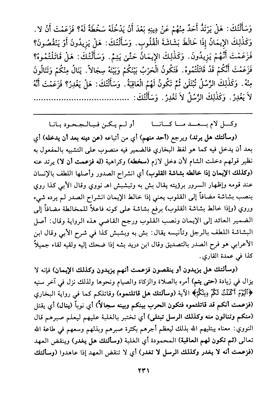 وَسَألتُكَ: هَل يَرتَدُّ أَحَدٌ مِنهُم عَن دِينِهِ بَعدَ أَن يَدخُلَهُ سَخطَةً لَهُ؟ فَزَعَمتَ أَن لا. وَكَذلِكَ الإيمَانُ إِذَا خَالطَ بَشَاشَةَ القُلُوبِ. وَسَألتُكَ: هَل يَزِيدُونَ أَوْ يَنقُصُونَ؟ فَزَعَمتَ أَنهُم يَزِيدُونَ. وَكَذلِكَ الإِيمَانُ حَتى يَتِمَّ. وَسَألتُكَ: هَل قَاتَلتُمُوهُ؟ فَزَعَمْتَ أَنكُمْ قَدْ قَاتَلْتُمُوهُ. فَتَكُونُ الْحَربُ بَينَكُم وَبَينَهُ سِجَالًا. يَنَالُ مِنكُم وَتَنَالُونَ مِنْهُ. وَكَذلِكَ الرسُلُ تُبتَلَى ثُم تَكُونُ لَهُمُ العَاقِبَةُ. وَسَألتُكَ: هَل يَغْدِرُ؟ فَزَعَمتَ أَنهُ لَا يَغْدِرُ. وَكَذلِكَ الرسُلُ لَا تَغْدِرُ. وَسَألتُكَ: