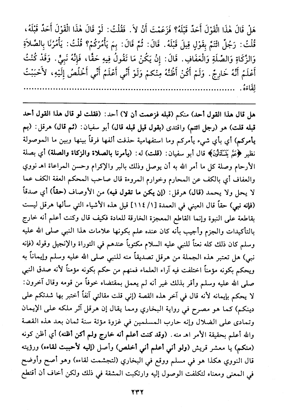 هَلْ قَال هذَا القَوْلَ أَحَد قَبْلَهُ؟ فَزَعَمتَ أَن لَا. فَقُلتُ: لَو قَال هذَا الْقَوْلَ أَحَد قَبلَهُ، قُلْتُ: رَجُلٌ ائْتَمَّ بِقَوْلٍ قِيلَ قَبْلَهُ. قَال: ثُم قَال: بِمَ يَأْمُرُكُم؟ قُلْتُ: يَأمُرُنَا بِالصلاةِ وَالزكَاةِ وَالصلَةِ وَالْعَفَافِ. قَال: إِن يَكُنْ مَا تَقُولُ فِيهِ حَقًّا، فَإِنهُ نَبِيٌّ. وَقَدْ كُنْتُ أَعْلَمُ أَنهُ خَارجٌ. وَلَمْ أَكُنْ أَظُنُّهُ مِنْكمْ وَلَوْ أَنِّي أَعْلَمُ أَني أَخْلُصُ إِلَيهِ، لأَحبَبْتُ لِقَاءَهُ