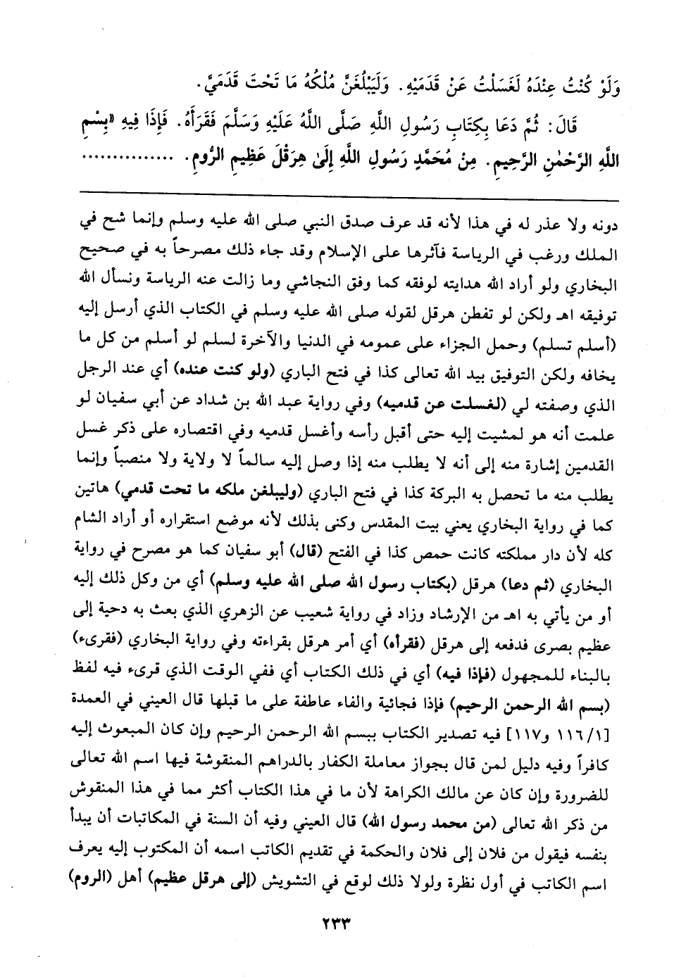 قَال: ثُم دَعَا بِكِتَابِ رَسُولِ الله صلى الله عَلَيهِ وَسَلمَ فَقَرَأَهُ. فَإِذَا فِيهِ "بِسْمِ الله الرحْمنِ الرحِيمِ. مِنْ مُحَمد رَسُولِ الله إِلَى هِرَقلَ عَظِيمِ الرومِ