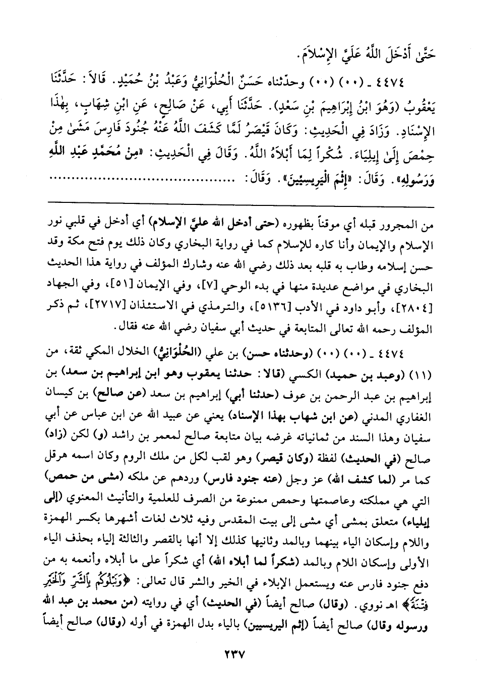 ٤٤٧٤ - (٠٠) (٠٠) وحدثناه حَسَنٌ الْحُلْوَانِي وَعَبْدُ بْنُ حُمَيدٍ. قَالا: حَدَّثَنَا يَعْقُوبُ (وَهُوَ ابْنُ إِبْرَاهِيمَ بْنِ سَعْدٍ). حَدَّثنَا أبِي، عَنْ صَالِحٍ، عَنِ ابْنِ شِهَابٍ، بِهذَا الإِسْنَادِ. وَزَادَ فِي الْحَدِيثِ: وَكَانَ قَيصَرُ لَما كَشَفَ اللَّهُ عَنْهُ جُنُودَ فَارِسَ مَشَى مِنْ حِمْصَ إِلَى إِيلِيَاءَ. شُكْرًا لِمَا أَبْلاهُ اللهُ. وَقَال فِي الْحَدِيثِ: "مِنْ مُحَمدِ عَبدِ الله وَرَسُولهِ". وَقَال: "إِثْمَ الْيَرِيسِيينَ". وَقَال:
