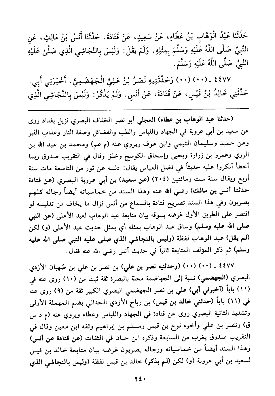 ٤٤٧٧ - (٠٠) (٠٠) (وحدثنيه نصر بن علي) بن نصر بن علي بن صُهبان الأزدي البصري (الجهضمي) نسبة إلى الجهاضمة محلة بالبصرة ثقة ثبت من (١٠) روى عنه في (١١) بابا (أخبرني أبي) علي بن نصر الجهضمي البصري الكبير ثقة من (٩) روى عنه في (١١) بابا (حدثني خالد بن قيس) بن رباح الأزدي الحداني بضم المهملة الأولى وتشديد الثانية البصري روى عن قتادة في الجهاد واللباس وعطاء ويروي عنه (م دس ق) ونصر بن علي وأخوه نوح بن قيس ومسلم بن إبراهيم وثقه ابن معين وقال في التقريب صدوق يغرب من السابعة وذكره ابن حبان في الثقات (عن قتادة عن أنس وهذا السند أيضًا من خماسياته ورجاله بصريون غرضه بيان متابعة خالد بن قيس لسعيد بن أبي عروبة (و) لكن (لم يذكر) خالد بن قيس لفظة (وليس بالنجاشي الدي