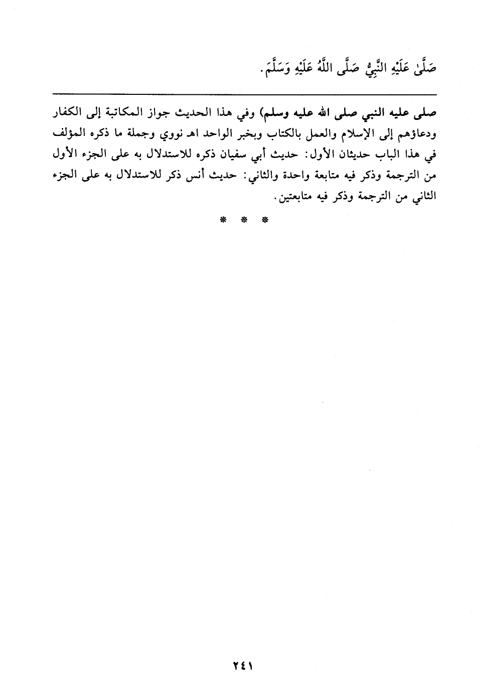 صلى عليه النبي صلى الله عليه وسلم) وفي هذا الحديث جواز المكاتبة إلى الكفار ودعاؤهم إلى الإسلام والعمل بالكتاب وبخبر الواحد اهـ نووي وجملة ما ذكره المؤلف في هذا الباب حديثان الأول: حديث أبي سفيان ذكره للاستدلال به على الجزء الأول من الترجمة وذكر فيه متابعة واحدة والثاني: حديث أنس ذكر للاستدلال به على الجزء الثاني من الترجمة وذكر فيه متابعتين.