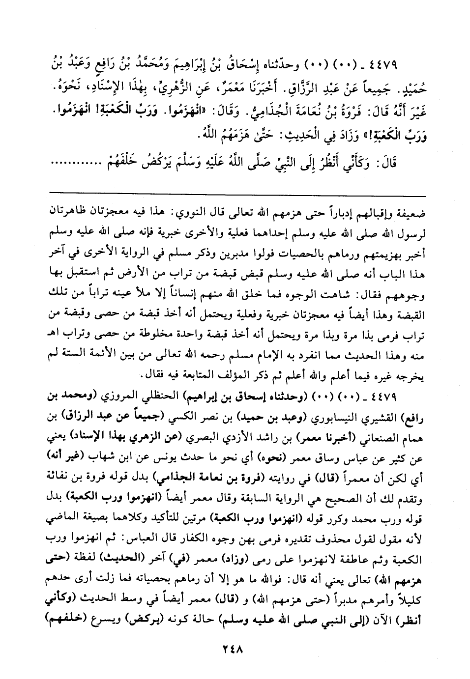٤٤٧٩ - (٠٠) (٠٠) وحدّثناه إِسْحَاقُ بْنُ إِبْرَاهِيمَ وَمُحَمدُ بْنُ رَافِعٍ وَعَبْدُ بْنُ حُمَيدٍ. جَمِيعًا عَنْ عَبْدِ الرَّزَّاقِ. أَخْبَرَنَا مَعْمَرٌ، عَنِ الزهْرِي، بِهذَا الإِسْنَادِ، نَحْوَهُ. غَيرَ أَنَّهُ قَال: فَرْوَةُ بْنُ نُعَامَةَ الْجُذَامي. وَقَال: "انْهَزَمُوا. وَرَب الْكَعْبَةِ! انْهَزَمُوا. وَرَب الكَعْبَةِ! " وَزَادَ فِي الحدِيثِ: حَتى هَزَمَهُمُ الله.