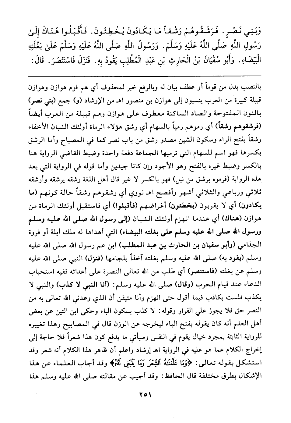 وَبَنِي نَصْرٍ. فَرَشَقُوهُمْ رَشْقًا مَا يَكَادُونَ يُخْطِئُونَ. فَأقْبَلُوا هُنَاكَ إِلَى رَسُولِ الله صلى الله عَلَيهِ وَسَلمَ. وَرَسُولُ اللهِ صلى اللَّهُ عَلَيهِ وَسَلَّمَ عَلَى بَغلَتِهِ الْبَيضَاءِ. وَأَبُو سُفْيَانَ بْنُ الْحَارِثِ بْنِ عَبْدِ الْمُطلِبِ يَقُودُ بِهِ. فَنَزَلَ فَاسْتَنصَرَ. قَال: