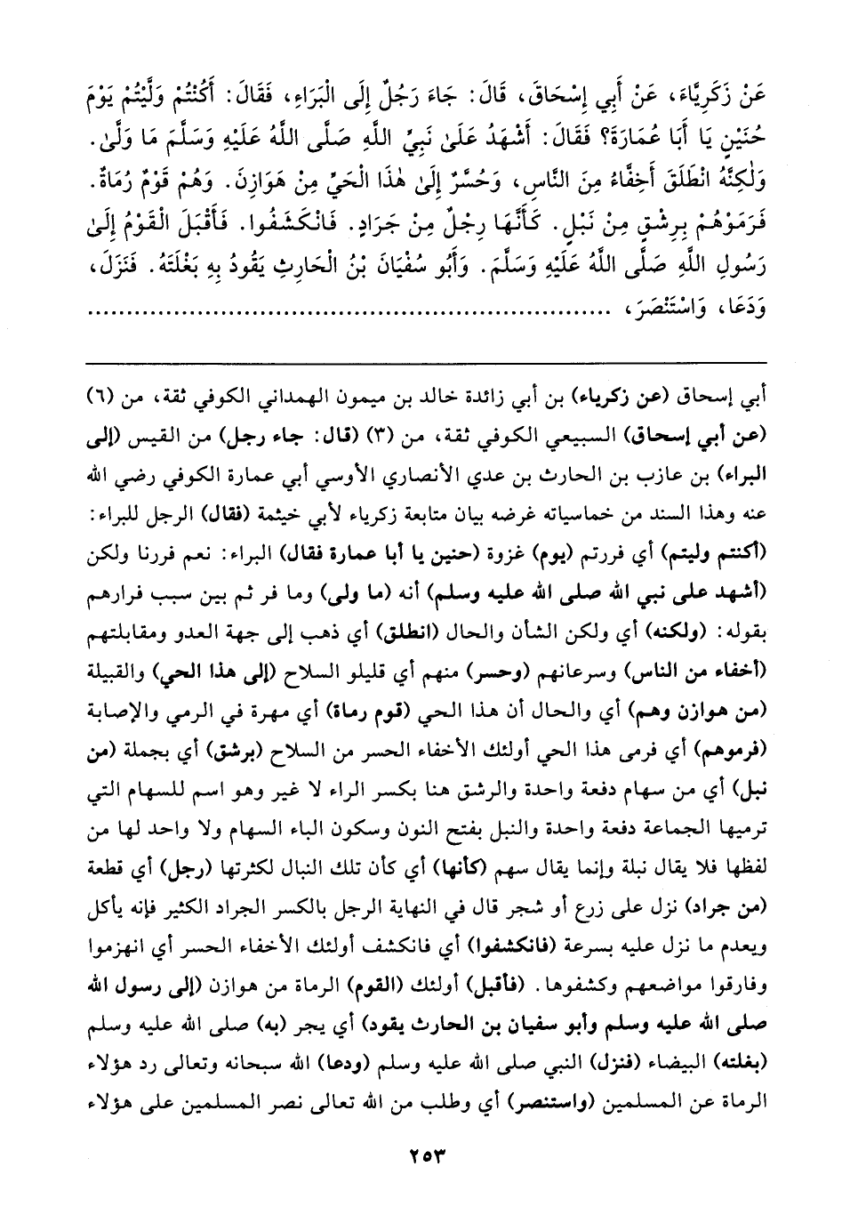 أبي إسحاق (عن زكرياء) بن أبي زائدة خالد بن ميمون الهمداني الكوفي ثقة، من (٦) (عن أبي إسحاق) السبيعي الكوفي ثقة، من (٣) (قال: جاء رجل) من القيس (إلى البراء) بن عازب بن الحارث بن عدي الأنصاري الأوسي أبي عمارة الكوفي رضي الله عنه وهذا السند من خماسياته غرضه بيان متابعة زكرياء لأبي خيثمة (فقال) الرجل للبراء: (أكنتم وليتم) أي فررتم (يوم) غزوة (حنين يا أبا عمارة فقال) البراء: نعم فررنا ولكن (أشهد على نبي الله صلى الله عليه وسلم) أنه (ما ولى) وما فر ثم بين سبب فرارهم بقوله: (ولكنه) أي ولكن الشأن والحال (انطلق) أي ذهب إلى جهة العدو ومقابلتهم (أخفاء من الناس) وسرعانهم (وحسر) منهم أي قليلو السلاح (إلى هذا الحي) والقبيلة (من هوازن وهم) أي والحال أن هذا الحي (قوم رماة) أي مهرة في الرمي والإصابة (فرموهم) أي فرمى هذا الحي أولئك الأخفاء الحسر من السلاح (برشق) أي بجملة (من نبل) أي من سهام دفعة واحدة والرشق هنا بكسر الراء لا غير وهو اسم للسهام التي ترميها الجماعة دفعة واحدة والنبل بفتح النون وسكون الباء السهام ولا واحد لها من لفظها فلا يقال نبلة وإنما يقال سهم (كأنها) أي كان تلك النبال لكثرتها (رجل) أي قطعة (من جراد) نزل على زرع أو شجر قال في النهاية الرجل بالكسر الجراد الكثير فإنه يأكل ويعدم ما نزل عليه بسرعة (فانكشفوا) أي فانكشف أولئك الأخفاء الحسر أي انهزموا وفارقوا مواضعهم وكشفوها. (فأقبل) أولئك (القوم) الرماة من هوازن (إلى رسول الله صلى الله عليه وسلم وأبو سفيان بن الحارث يقود) أي يجر (به) صلى الله عليه وسلم (بغلته) البيضاء (فنزل) النبي صلى الله عليه وسلم (ودعا) الله سبحانه وتعالى رد هؤلاء الرماة عن المسلمين (واستنصر) أي وطلب من الله تعالى نصر المسلمين على هؤلاء
