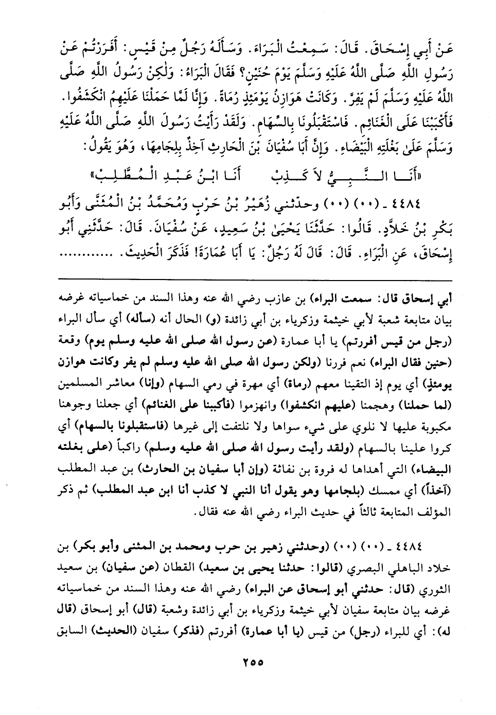 عَنْ أَبِي إِسحَاقَ. قَال: سَمِعْتُ الْبَرَاءَ. وَسَأَلَهُ رَجُلٌ مِن قَيسٍ: أَفَرَرتُم عَن رَسُولِ الله صلى الله عَلَيهِ وَسَلمَ يَومَ حُنَينٍ؟ فَقَال البَرَاءُ: وَلكِن رَسُولُ الله صلى الله عَلَيهِ وَسَلمَ لَمْ يَفِرَّ. وَكَانَتْ هَوَازِنُ يَوْمَئِذٍ رُمَاةً. وإنا لَما حَمَلْنَا عَلَيهِمُ انكَشَفُوا. فَأكْبَبْنَا عَلَى الْغَنَائِمِ. فَاستَقْبَلُونَا بِالسهَامِ. وَلَقَدْ رَأَيتُ رَسُولَ الله صلى الله عَلَيهِ وَسَلَّمَ عَلَى بَغْلَتِهِ الْبَيضاءِ. وإن أَبَا سُفيَانَ بْنَ الْحَارِثِ آخِذٌ بِلِجَامِهَا، وَهُوَ يَقُولُ:
