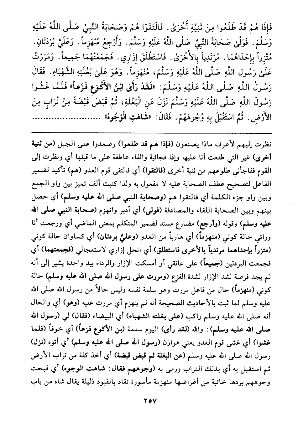 نظرت إليهم لأعرف ماذا يصنعون (فإذا هم قد طلعوا) وصعدوا على الجبل (من ثنية أخرى) غير التي طلعت أنا عليها وإذا فجائية والفاء عاطفة على ما قبلها أي ونظرت إلى القوم ففاجأني طلوعهم من ثنية أخرى (فالتقوا) أي فالتقى قوم العدو (هم) تأكيد لضمير الفاعل لتصحيح عطف الصحابة عليه لا مفعول به ولذا كتبت ألف تميز بين واو الجمع وبين واو جزء الكلمة أي فالتقوا هم (وصحابة النبي صلى الله عليه وسلم) أي حصل بينهم وبين الصحابة اللقاء والمصادفة (فولى) أي أدبر وانهزم (صحابة النبي صلى الله عليه وسلم) وقوله (وأرجع) مضارع مسند لضمير المتكلم بمعنى الماضي أي ورجعت أنا ورائي حالة كوني (منهزمًا) أي هاربًا من العدو (وعليَّ بردتان) أي كساوان حالة كوني (متزرًا بإحداهما مرتديًا بالأخرى فاستطلق) أي انحل إزاري لاستعجالي (فجمعتهما) أي فجمعت البردتين (جميعا) على عاتقي أو أمسكت الإزار والرداء بيد واحدة يشير إلى أنه لم يجد فرصة لشد الإزار لشدة الفزع (ومررت على رسول الله صلى الله عليه وسلم) حالة كوني (منهزمًا) حال من فاعل مررت وهو سلمة نفسه وليس حالًا من رسول الله صلى الله عليه وسلم لما ثبت بالأحاديث الصحيحة أنه لم ينهزم أي مررت عليه (وهو) أي والحال أنه صلى الله عليه وسلم راكب (على بغلته الشهباء) أي البيضاء (فقال) لي (رسول الله صلى الله عليه وسلم): والله (لقد رأى) اليوم سلمة (بن الأكوع فزعًا) أي خوفًا (فلما غشوا) أي كشى قوم العدو يعني هوازن (رسول الله صلى الله عليه وسلم) أي أتوه (نزل) رسول الله صلى الله عليه وسلم (عن البنلة ثم قبض قبضة) أي أخذ كفة من تراب الأرض ثم استقبل به أي بذلك التراب ورمى به (وجوههم فقال: شاهت الوجوه) أي قبحت وجوههم بردها خائبة من أغراضها منهزمة مأسورة تقاد بالقيود ذليلة يقال شاه من باب