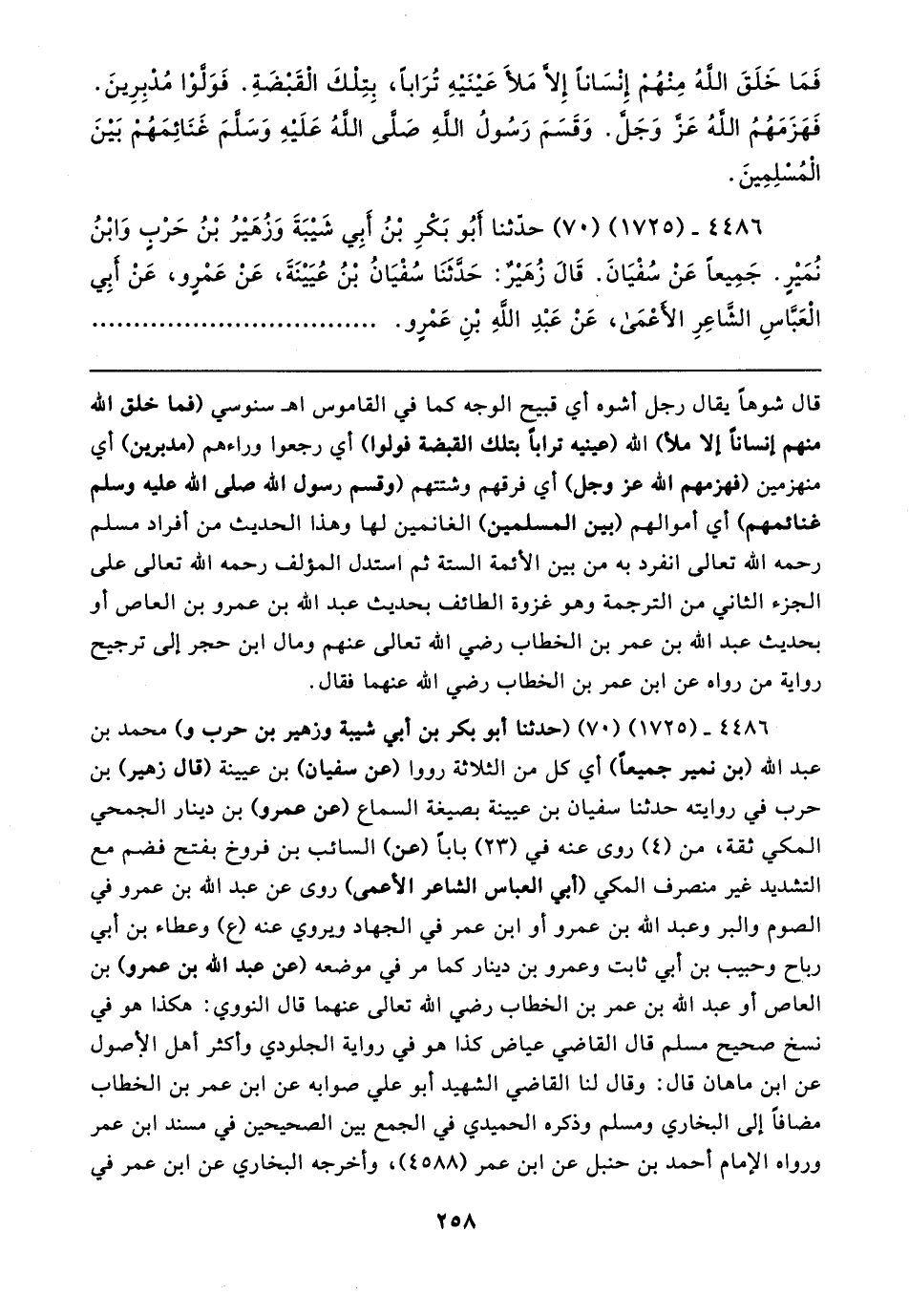 ٤٤٨٦ - (١٧٢٥) (٧٠) حدَّثنا أبُو بَكْرٍ بْنُ أَبِي شَيبَةَ وَزُهَيرُ بْنُ حَرْبٍ وَابْنُ نُمَيرٍ. جَمِيعًا عَنْ سُفْيَانَ. قَال زُهَيرٌ: حَدَّثَنَا سُفْيَانُ بْنُ عُيَينَةَ، عَنْ عَمْرٍو، عَنْ أبِي الْعَبَّاسِ الشَّاعِرِ الأعْمَى، عَنْ عَبْدِ اللهِ بْنِ عَمْرٍو