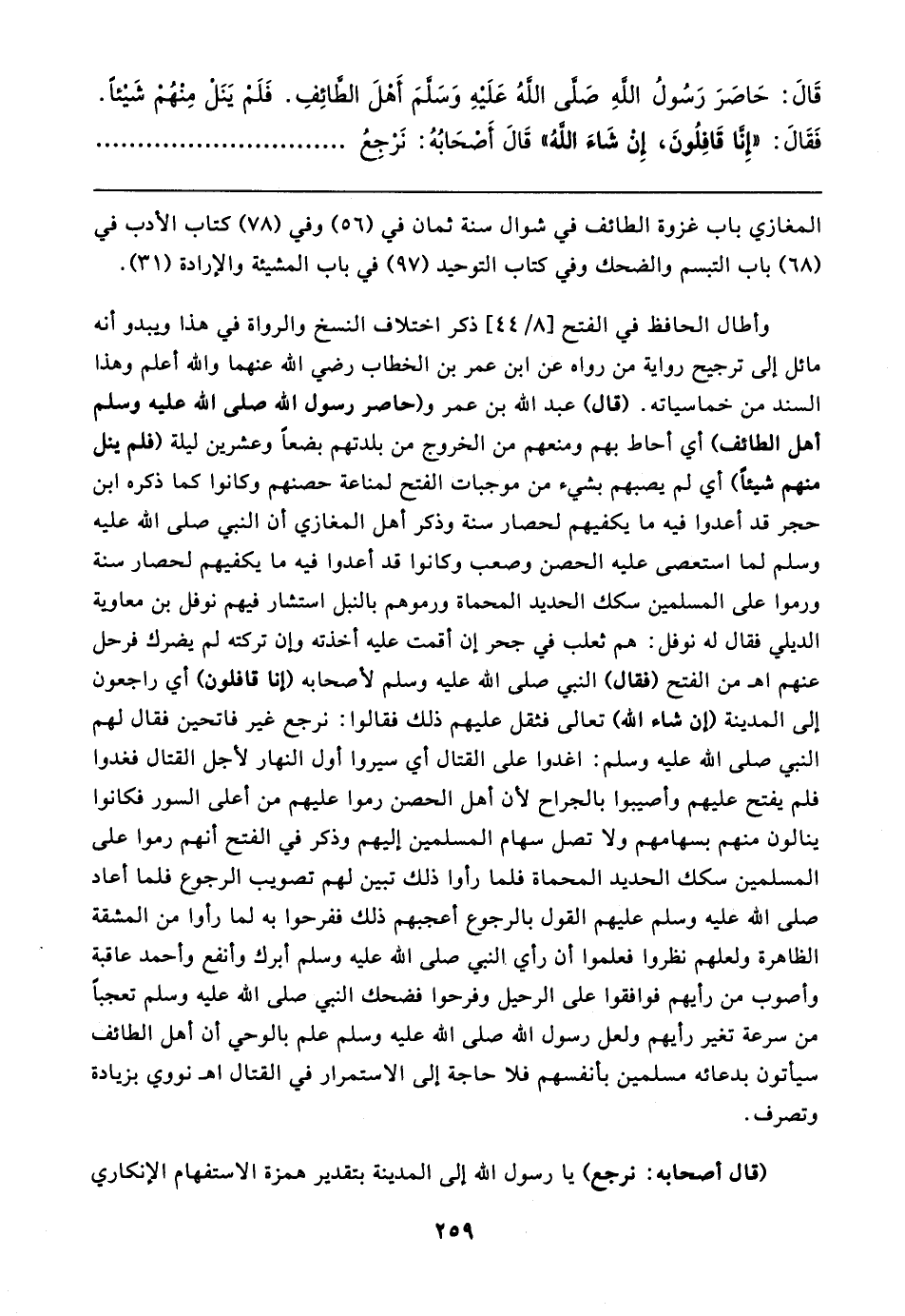 قَال: حَاصَرَ رَسُولُ اللهِ صَلَّى اللهُ عَلَيهِ وَسَلَّمَ أَهْلَ الطَّائِفِ. فَلَمْ يَنَلْ مِنْهُمْ شَيئًا. فَقَال: "إِنَّا قَافِلُونَ، إِنْ شَاءَ اللهُ" قَال أَصْحَابُهُ: نَرْجِعُ