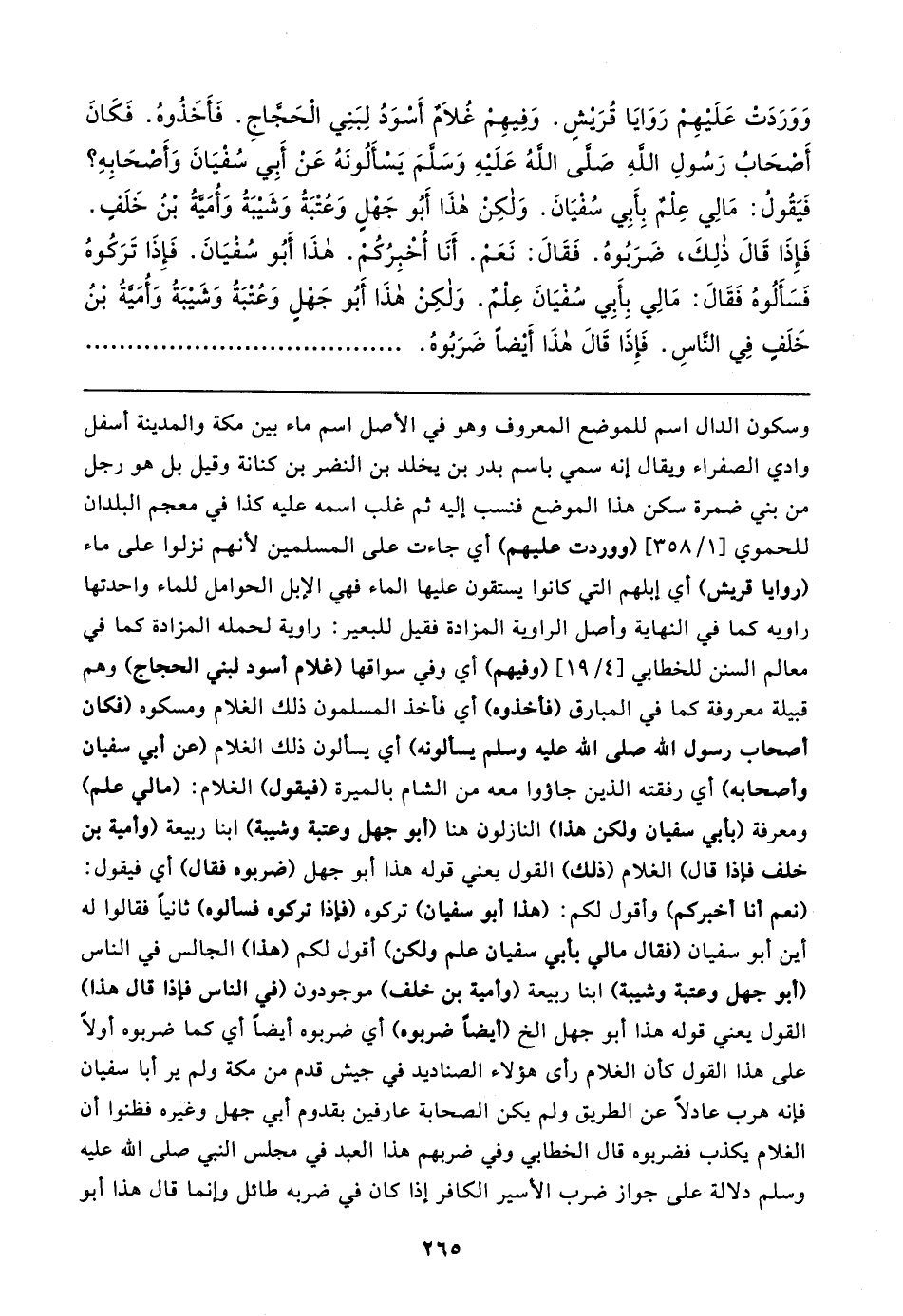 وَوَرَدَتْ عَلَيهِمْ رَوَايَا قُرَيشٍ. وَفِيهِمْ غُلامٌ أَسْوَدُ لِبَنِي الْحَجَّاجِ. فَأَخَذُوهُ. فَكَانَ أَصْحَابُ رَسُولِ اللهِ صَلَّى اللهُ عَلَيهِ وَسَلَّمَ يَسْأْلُونَهُ عَنْ أَبِي سُفْيَانَ وَأَصْحَابِهِ؟ فَيَقُولُ: مَا لِي عِلْمٌ بِأَبِي سُفْيَانَ. وَلكِنْ هذَا أَبُو جَهْلٍ وَعُتْبَةُ وَشَيبَةُ وَأُمَيَّةُ بْنُ خَلَفٍ. فَإِذَا قَال ذلِكَ، ضَرَبُوهُ. فَقَال: نَعَمْ. أَنَا أُخْبِرُكُمْ. هذَا أَبُو سُفْيَانَ. فَإِذَا تَرَكُوهُ فَسَأَلُوهُ فَقَال: مَا لِي بِأَبِي سُفْيَانَ عِلْمٌ. وَلكِنْ هذَا أَبُو جَهْل وَعُتْبَةُ وَشَيبَةُ وَأُمَيَّةُ بْنُ خَلَفٍ فِي النَّاسِ. فَإِذَا قَال هذَا أَيضًا ضَرَبُوهُ