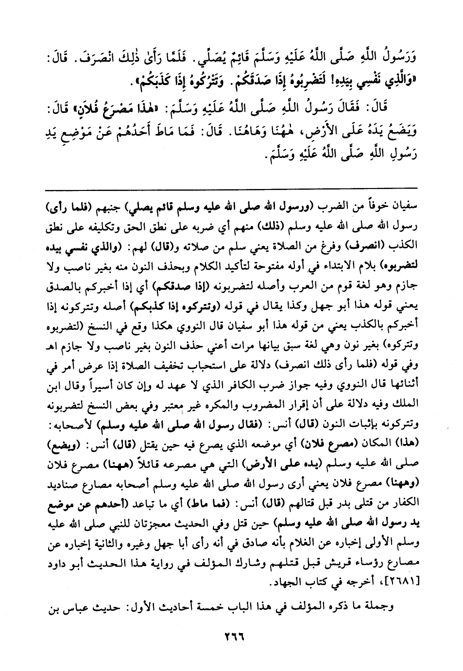 وَرَسُولُ اللهِ صَلَّى اللهُ عَلَيهِ وَسَلَّمَ قَائِمٌ يُصَلِّي. فَلَمَّا رَأَى ذلِكَ انْصَرَفَ. قَال: "وَالَّذي نَفْسِي بِيَدِهِ! لَتَضرِبُوهُ إِذَا صَدَقَكُمْ. وَتَتْرُكُوهُ إِذَا كَذَبَكُمْ".