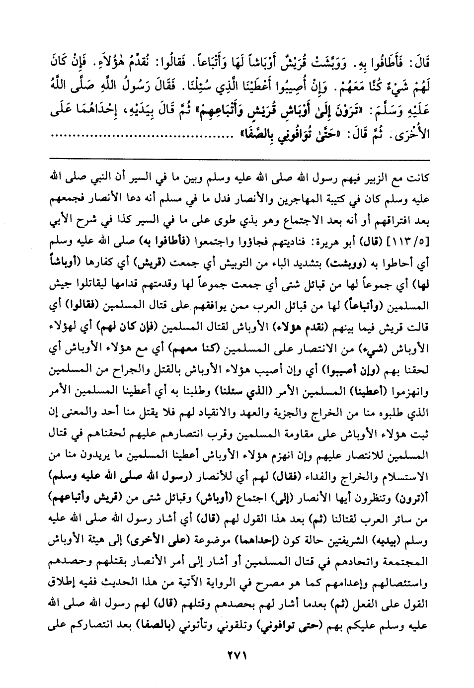 قَال: فَأَطَافُوا بِهِ. وَوَبَّشَت قُرَيشٌ أَوْبَاشًا لَهَا وَأَتبَاعًا. فَقالُوا: نُقدِّمُ هؤُلاءِ. فَإِنْ كَانَ لَهُمْ شَيءٌ كُنا مَعَهُمْ. وَإِنْ أُصِيبُوا أَعْطَينَا الَّذِي سُئِلْنَا. فَقَال رَسُولُ اللهِ صَلَّى اللهُ عَلَيهِ وَسَلَّمَ: "تَرَوْنَ إِلَى أَوْبَاشِ قُرَيشٍ وَأَتْبَاعِهِمْ" ثُمَّ قَال بِيَدَيهِ، إِحْدَاهُمَا عَلَى الأُخرَى. ثُمَّ قَال: "حَتَّى تُوَافُونِي بِالصَّفَا"