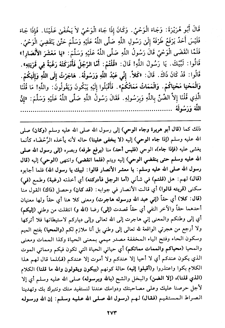 قَال أَبُو هُرَيرَةَ: وَجَاءَ الْوَحْيُ. وَكَانَ إِذَا جَاءَ الْوَحْيُ لَا يَخْفَى عَلَينَا. فَإِذَا جَاءَ فَلَيسَ أَحَدٌ يَرْفَعُ طَرْفَهُ إِلَى رَسُولِ اللهِ صَلَّى اللهُ عَلَيهِ وَسَلَّمَ حَتَّى يَنْقَضِيَ الْوَحْيُ. فَلَمَّا انْقَضَى الْوَحْيُ قَال رَسُولُ اللهِ صَلَّى اللهُ عَلَيهِ وَسَلَّمَ: "يَا مَعْشَرَ الأَنْصَارِ! " قَالُوا: لَبَّيكَ. يَا رَسُولَ اللهِ! قَال: "قُلْتُم: أَمَّا الرَّجُلُ فَأَدْرَكَتْهُ رَغْبَةً فِي قَرْيَتِهِ". قَالُوا: قَدْ كَانَ ذَاكَ. قَال: "كَلَّا. إِنِّي عَبدُ اللهِ وَرَسُولُهُ. هَاجَرْتُ إِلَى اللهِ وَإلَيكُمْ. وَالْمَحْيَا مَحْيَاكُمْ. وَالْمَمَاتُ مَمَاتُكُم". فَأَقْبَلُوا إِلَيهِ يَبْكُونَ وَيقُولُونَ: واللهِ! مَا قُلْنَا الَّذِي قُلْنَا إِلَّا الضِّنَّ بِاللهِ وَبِرَسُولِهِ. فَقَال رَسُولُ اللهِ صَلَّى اللهُ عَلَيهِ وَسَلَّمَ: "إِنَّ اللهَ وَرَسُولَهُ