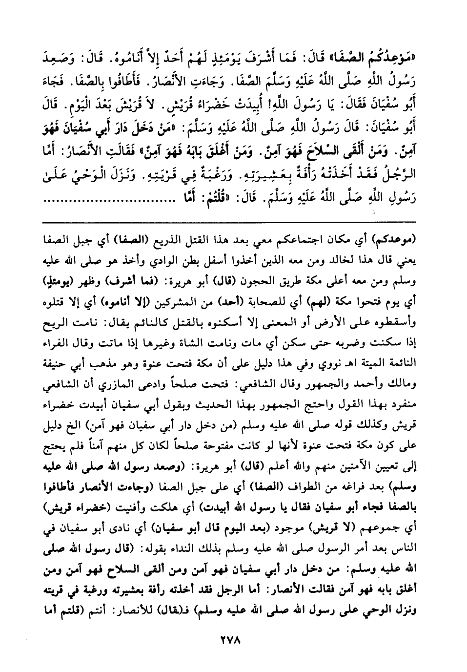 "مَوْعِدُكُمُ الصَّفَا" قَال: فَمَا أَشرَفَ يَومَئِذٍ لَهُمْ أَحَدٌ إِلَّا أَنَامُوهُ. قَال: وَصَعِدَ رَسُولُ اللهِ صَلَّى اللهُ عَلَيهِ وَسَلَّمَ الصَّفَا. وَجَاءَتِ الأَنْصَارُ. فَأَطَافُوا بِالصَّفَا. فَجَاءَ أَبُو سُفْيَانَ فَقَال: يَا رَسُولَ اللهِ! أُبِيدَت خَضرَاءُ قُرَيشٍ. لَا قُرَيشَ بَعْدَ الْيَوْمِ. قَال أَبُو سُفْيَانَ: قَال رَسُولُ اللهِ صَلَّى اللهُ عَلَيهِ وَسَلَّمَ: "مَنْ دَخَلَ دَارَ أَبي سُفْيَانَ فَهُوَ آمِنٌ. وَمَنْ أَلْقَى السِّلاحَ فَهُوَ آمِنٌ. وَمَنْ أَغلَقَ بَابَهُ فَهُوَ آمِنٌ" فَقَالتِ الأَنْصَارُ: أَمَّا الرَّجُلُ فَقَدْ أَخَذَتهُ رَأْفَةٌ بِعَشِيرَتِهِ. وَرَغبَةٌ فِي قَرْيَتِهِ. وَنَزَلَ الْوَحْيُ عَلَى رَسُولِ اللهِ صَلَّى اللهُ عَلَيهِ وَسَلَّمَ. قَال: "قُلْتُم: أَمَّا