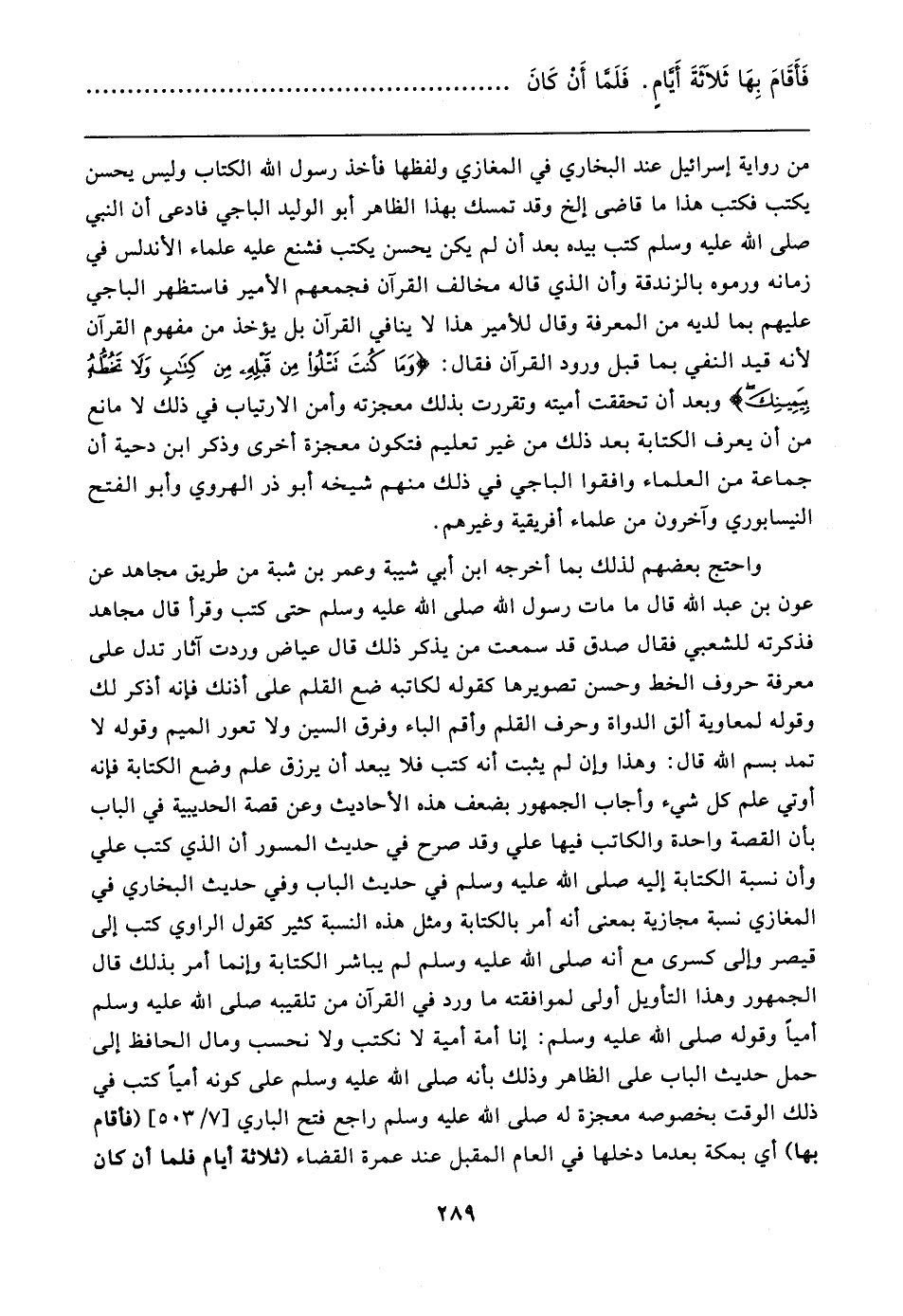 من رواية إسرائيل عند البخاري في المغازي ولفظها فأخذ رسول الله الكتاب وليس يحسن يكتب فكتب هذا ما قاضى إلخ وقد تمسك بهذا الظاهر أبو الوليد الباجي فادعى أن النبي صلى الله عليه وسلم كتب بيده بعد أن لم يكن يحسن يكتب فشنع عليه علماء الأندلس في زمانه ورموه بالزندقة وأن الذي قاله مخالف القرآن فجمعهم الأمير فاستظهر الباجي عليهم بما لديه من المعرفة وقال للأمير هذا لا ينافي القرآن بل يؤخذ من مفهوم القرآن لأنه قيد النفي بما قبل ورود القرآن فقال: {وَمَا كُنْتَ تَتْلُو مِنْ قَبْلِهِ مِنْ كِتَابٍ وَلَا تَخُطُّهُ بِيَمِينِكَ} وبعد أن تحققت أميته وتقررت بذلك معجزته وأمن الارتياب في ذلك لا مانع من أن يعرف الكتابة بعد ذلك من غير تعليم فتكون معجزة أخرى وذكر ابن دحية أن جماعة من العلماء وافقوا الباجي في ذلك منهم شيخه أبو ذر الهروي وأبو الفتح النيسابوري وآخرون من علماء أفريقية وغيرهم.