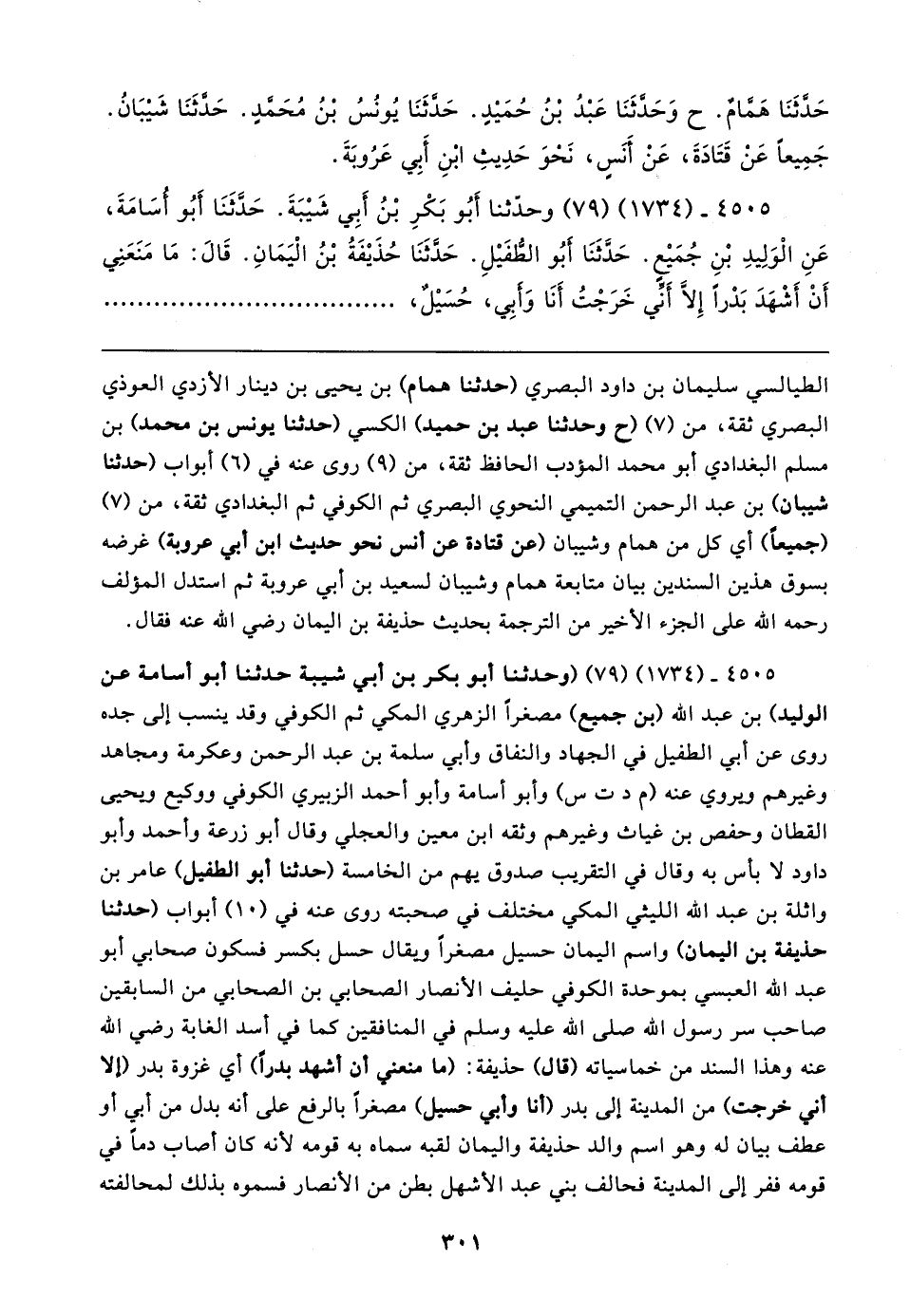 ٤٥٠٥ - (١٧٣٤) (٧٩) وحدّثنا أبُو بَكْرٍ بْنُ أَبِي شَيبَةَ. حَدَّثَنَا أَبُو أسَامَةَ، عَنِ الْوَلِيدِ بْنِ جُمَيعٍ. حَدَّثَنَا أَبُو الطُّفَيلِ. حَدَّثَنَا حُذَيفَةُ بْنُ الْيَمَانِ. قَال: مَا مَنَعَنِي أَنْ أَشْهَدَ بَدْرًا إِلَّا أَنِّي خَرَجْتُ أَنَا وَأَبِي، حُسَيلٌ،
