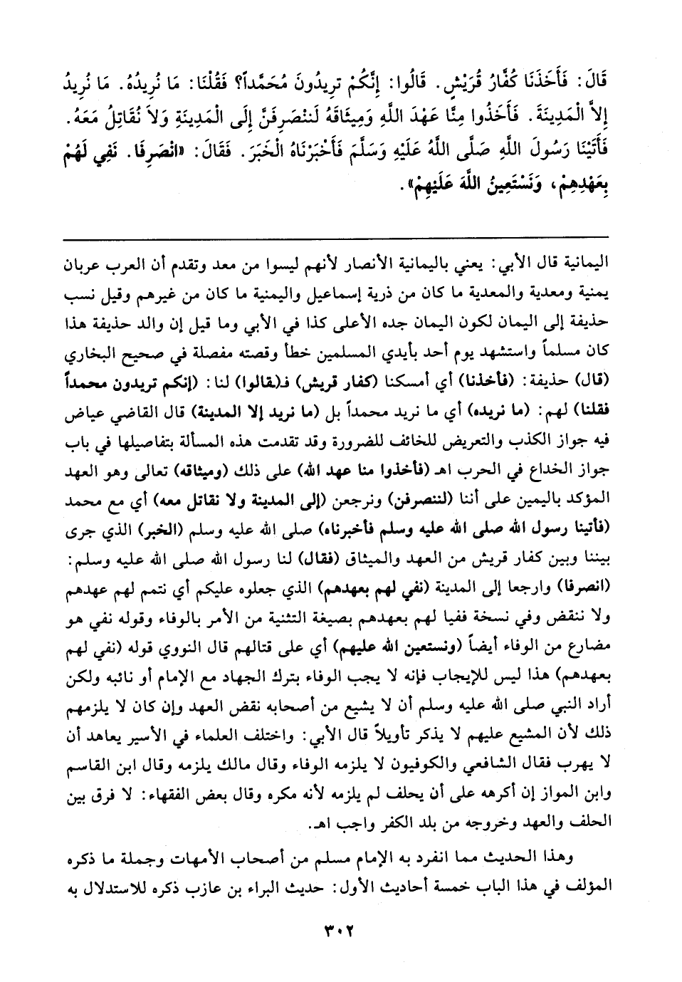 قَال: فَأَخَذَنَا كُفَّارُ قُرَيشٍ. قَالُوا: إِنَّكُمْ ترِيدُونَ مُحَمَّدًا؟ فَقُلْنَا: مَا نُرِيدهُ ُ. مَا نُرِيدُ إِلَّا الْمَدِينَةَ. فَأَخَذُوا مِنا عَهْدَ اللهِ وَمِيثَاقَهُ لَننْصَرِفَنَّ إِلَى الْمَدِينَةِ وَلَا نُقَاتِلُ مَعَهُ. فَأَتَينَا رَسُولَ اللهِ صَلَّى اللَّهُ عَلَيهِ وَسَلَّمَ فَأَخبَرْنَاهُ الخَبَرَ. فَقَال: "انْصَرِفَا. نَفِي لَهُمْ بِعَهْدِهِمْ، وَنَسْتَعِينُ اللهَ عَلَيهِمْ"