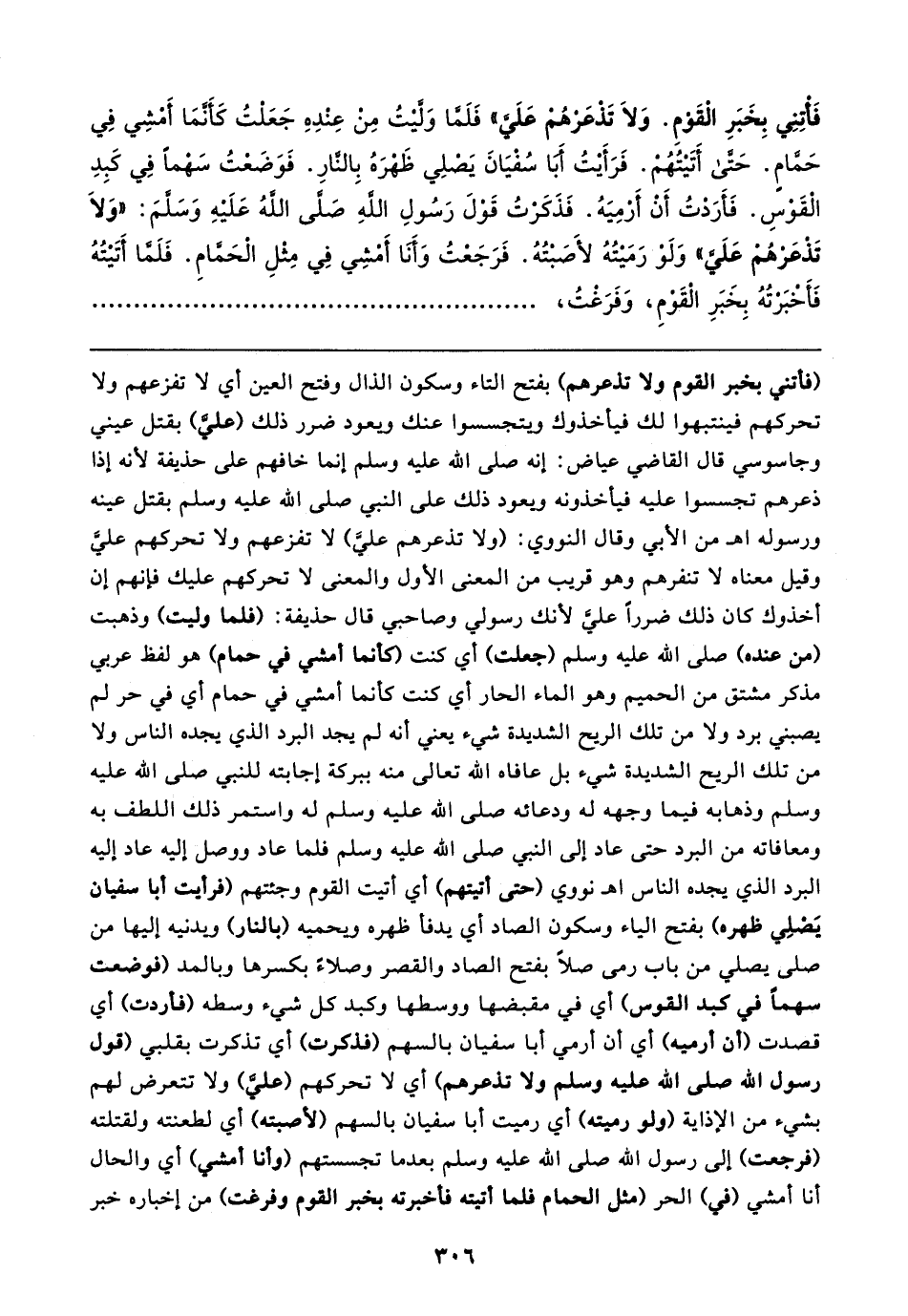 فَأْتِنِي بِخَبَرِ الْقَوْمِ. وَلَا تَذْعَرْهُمْ عَلَيَّ". فَلَمَّا وَلَّيتُ مِنْ عِنْدِهِ جَعَلْتُ كَأَنَّمَا أَمْشِي فِي حَمَّامٍ. حَتَّى أَتَيتُهُمْ. فَرَأَيتُ أَبَا سُفْيَانَ يَصْلِي ظَهْرَهُ بِالنَّارِ. فَوَضَعْتُ سَهْمًا فِي كَبِدِ الْقَوْسِ. فَأَرَدْتُ أَنْ أَرْمِيَهُ. فَذَكَرْتُ قَوْلَ رَسُولِ اللَّهِ صلى الله عليه وسلم: "وَلَا تَذْعَرْهُمْ عَلَيَّ" وَلَوْ رَمَيتُهُ لأَصَبْتُهُ. فَرَجَعْتُ وَأَنَا أَمْشِي فِي مِثْلِ الْحَمَّامِ. فَلَمَّا أَتَيتُهُ فَأَخْبَرْتُهُ بِخَبَرِ الْقَوْمِ, وَفَرَغْتُ,