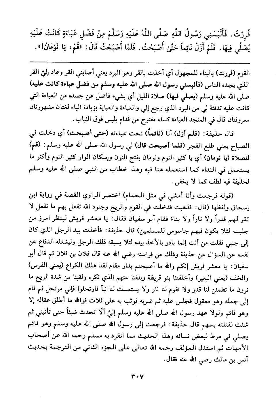 قُرِرْتُ. فَأَلْبَسَنِي رَسُولُ اللهِ صلى الله عليه وسلم مِنْ فَضْلِ عَبَاءَةٍ كَانَتْ عَلَيهِ يُصَلِّي فِيهَا. فَلَمْ أَزَلْ نَائِمًا حَتَّى أَصْبَحْتُ. فَلَمَّا أَصْبَحْتُ قَال: "قُمْ يَا نَوْمَانُ"