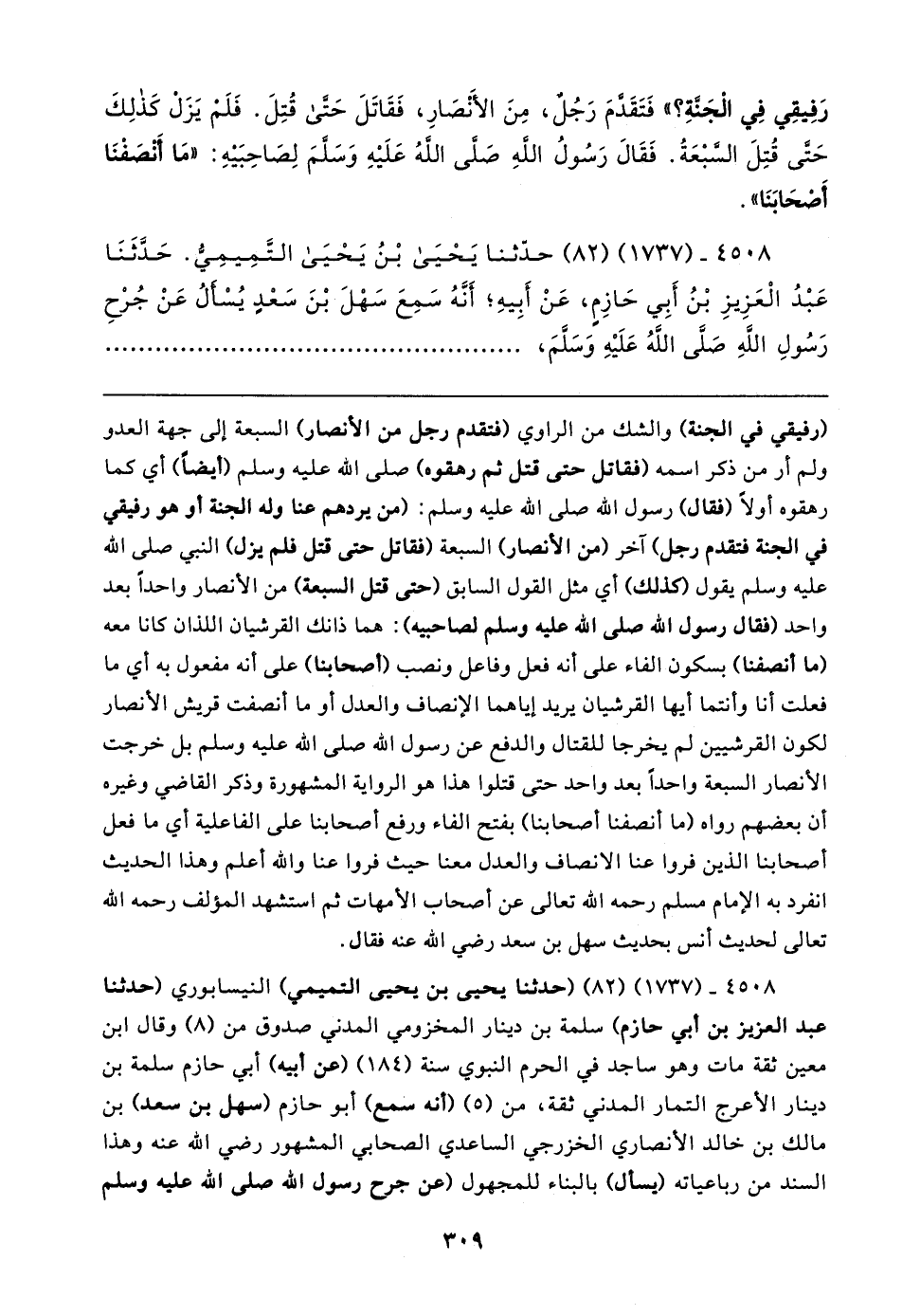 ٤٥٠٨ - (١٧٣٧) (٨٢) (حدثنا يحيى بن يحيى التميمي) النيسابوري (حدثنا عبد العزيز بن أبي حازم) سلمة بن دينار المخزومي المدني صدوق من (٨) وقال ابن معين ثقة مات وهو ساجد في الحرم النبوي سنة (١٨٤) (عن أبيه) أبي حازم سلمة بن دينار الأعرج التمار المدني ثقة، من (٥) (أنه سمع) أبو حازم (سهل بن سعد) بن مالك بن خالد الأنصاري الخزرجي الساعدي الصحابي المشهور رضي الله عنه وهذا السند من رباعياته (يسأل) بالبناء للمجهول (عن جرح رسول الله صلى الله عليه وسلم