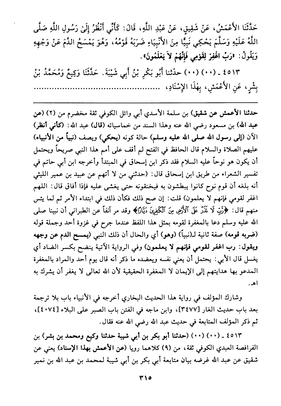 حَدَّثَنَا الأَعْمَشُ، عَنْ شَقِيقٍ، عَنْ عَبْدِ اللَّهِ، قَال: كَأَنِّي أَنْظُرُ إِلَى رَسُولِ اللَّهِ صلى الله عليه وسلم يَحْكِي نَبِيًّا مِنَ الأَنْبِيَاءِ ضَرَبَهُ قَوْمُهُ, وَهُوَ يَمْسَحُ الدَّمَ عَنْ وَجْهِهِ وَيَقُولُ: "رَبِّ اغْفِرْ لِقَوْمِي فَإِنَّهُمْ لَا يَعْلَمُونَ".