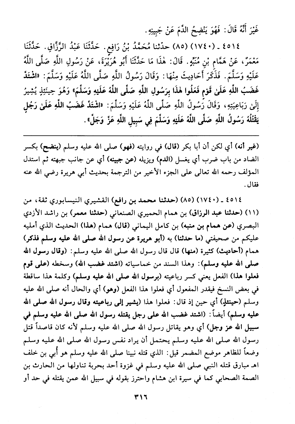 ٤٥١٤ - (١٧٤٠) (٨٥) (حدثنا محمد بن رافع) القشيري النيسابوري ثقة، من (١١) (حدثنا عبد الرزاق) بن همام الحميري الصنعاني (حدثنا معمر) بن راشد الأزدي البصري (عن همام بن منبه) بن كامل اليماني (قال) همام (هذا) الحديث الذي أمليه عليكم من صحيفتي (ما حدثنا) به (أبو هريرة عن رسول الله صلى الله عليه وسلم فذكر) همام (أحاديث) كثيرة (منها) قال قال رسول الله صلى الله عليه وسلم: (وقال رسول الله صلى الله عليه وسلم): وهذا السند من خماسياته (اشتد غضب الله) وسخطه (على قوم فعلوا هذا) الفعل يعني كسر رباعيته (برسول الله صلى الله عليه وسلم) وكلمة هذا ساقطة في بعض النسخ فيقدر المفعول أي فعلوا هذا الفعل (وهو) أي والحال أنه صلى الله عليه وسلم (حينئذٍ) أي حين إذ قال: فعلوا هذا (يشير إلى رباعيته وقال رسول الله صلى الله عليه وسلم) أيضًا: (اشتد غضب الله على رجل يقتله رسول الله صلى الله عليه وسلم في سبيل الله عزَّ وجلَّ) أي وهو يقاتل رسول الله صلى الله عليه وسلم لأنه كان قاصدًا قتل رسول الله صلى الله عليه وسلم يحتمل أن يراد نفس رسول الله صلى الله عليه وسلم وضعًا للظاهر موضع المضمر قيل: الذي قتله نبينا صلى الله عليه وسلم هو أبي بن خلف اهـ مبارق قتله النبي صلى الله عليه وسلم في غزوة أحد بحربة تناولها من الحارث بن الصمة الصحابي كما في سيرة ابن هشام واحترز بقوله في سبيل الله عمن يقتله في حد أو