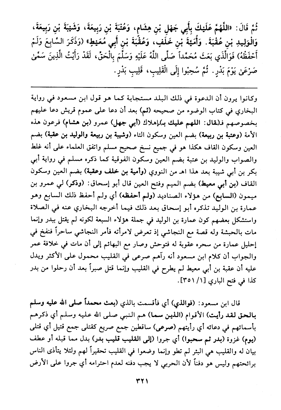 ثُمَّ قَال: "اللَّهُمَّ عَلَيكَ بِأَبِي جَهْلِ بْنِ هِشَامٍ, وَعُتْبَةَ بْنِ رَبِيعَةَ, وَشَيبَةَ بْنِ رَبِيعَةَ, وَالْوَلِيدِ بْنِ عُقْبَةَ. وَأُمَيَّةَ بْنِ خَلَفٍ, وَعُقْبَةَ بْنِ أَبِي مُعَيطٍ" (وَذَكَرَ السَّابِعَ وَلَمْ أَحْفَظْهُ) فَوَالَّذِي بَعَثَ مُحَمَّدًا صلى الله عليه وسلم بِالْحَقِّ, لَقَدْ رَأَيتُ الَّذِينَ سَمَّى صَرْعَى يَوْمَ بَدْرٍ. ثُمَّ سُحِبُوا إِلَى الْقَلِيبِ, قَلِيبِ بَدْرٍ